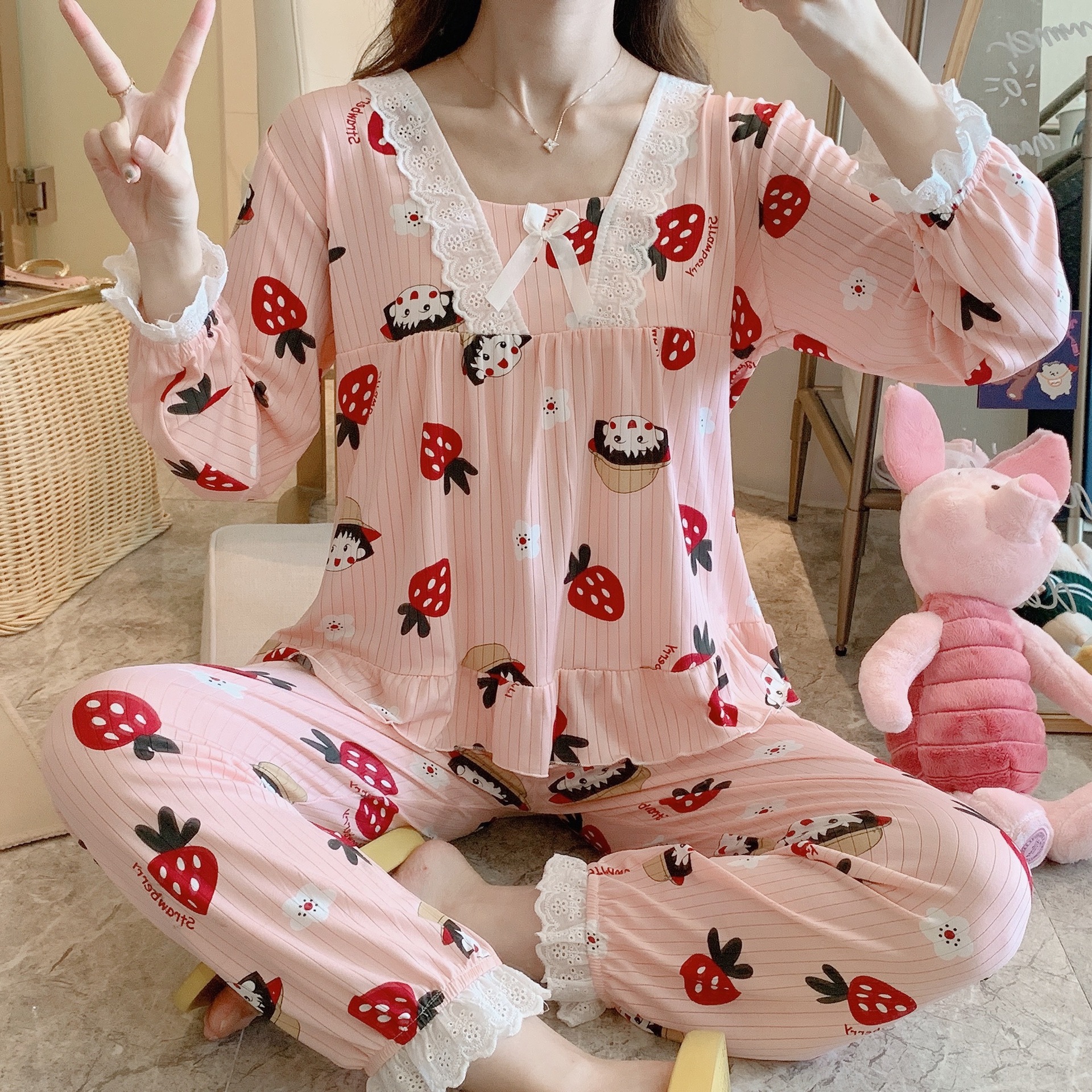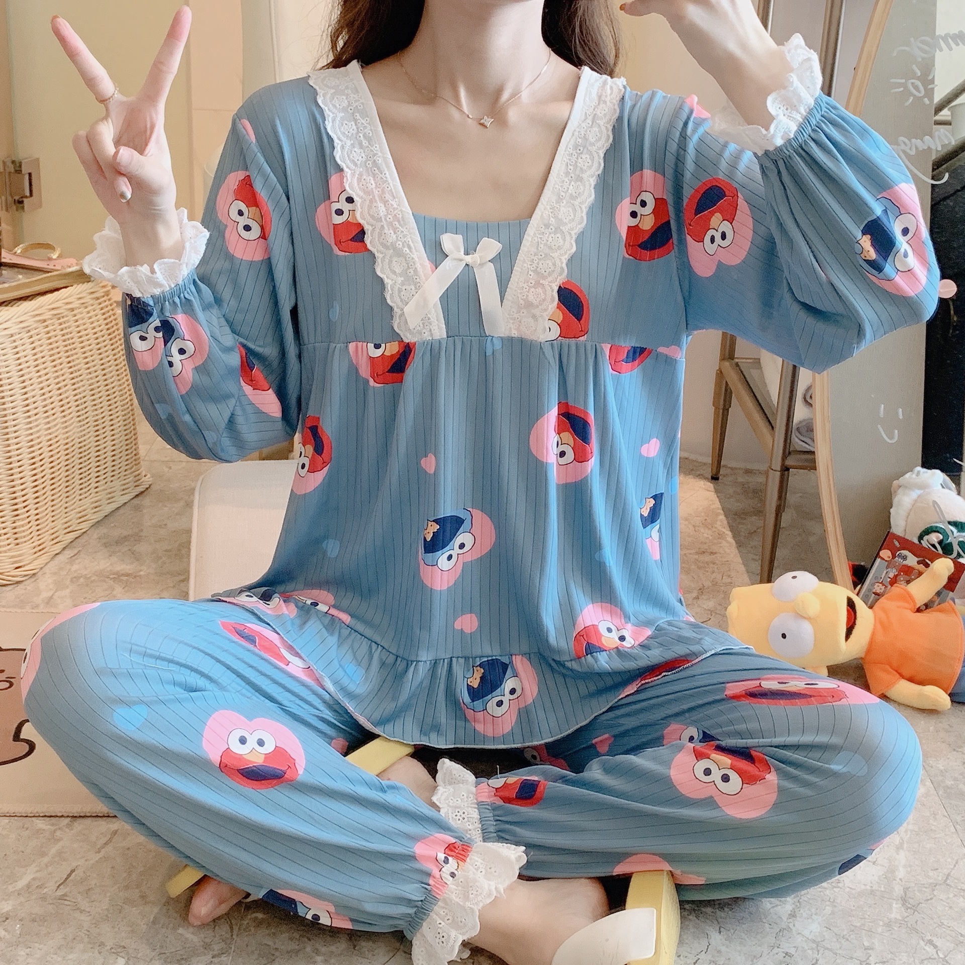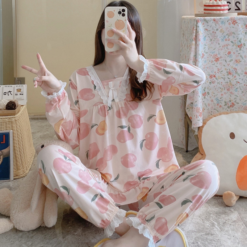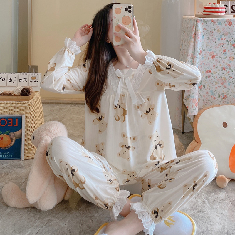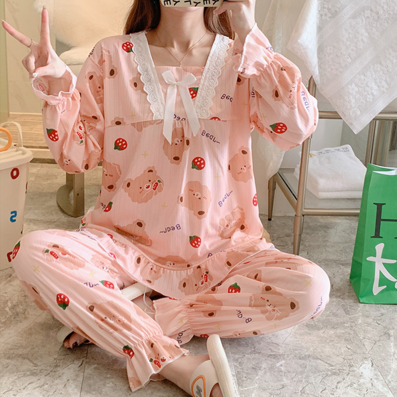 봄과 가을 공주 긴팔 잠옷 바지 반팔 여성용 얇은 만화 스포츠 홈웨어 한국식 귀여운 투피스 세트스토어 가기