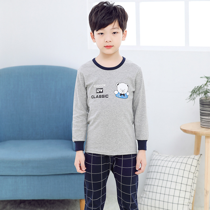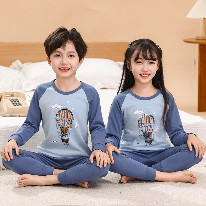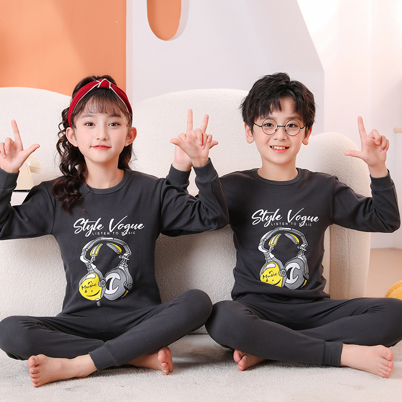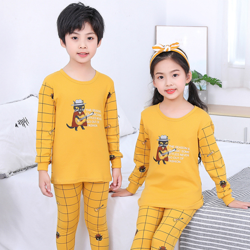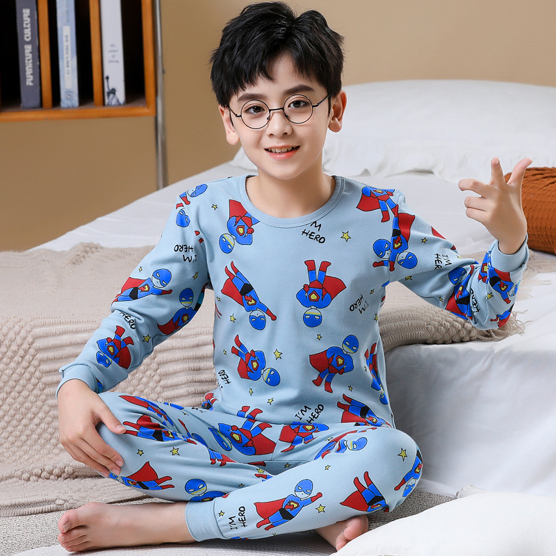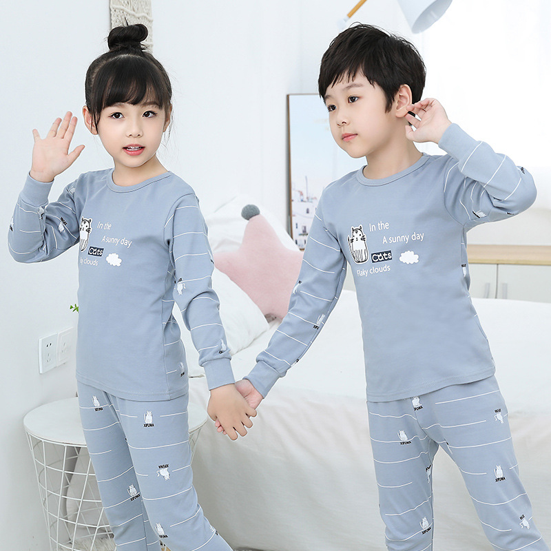 어린이 속옷 세트, 어린이 순면 가을 옷 세트, 남아 및 여아 순면 라운드넥 홈웨어 잠옷, 만화 프린트