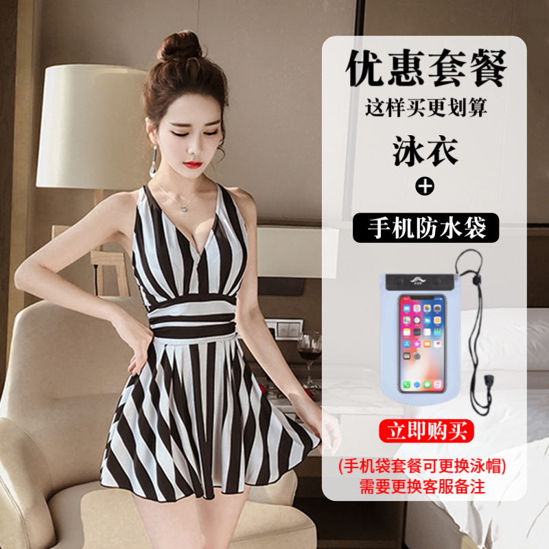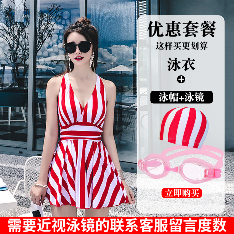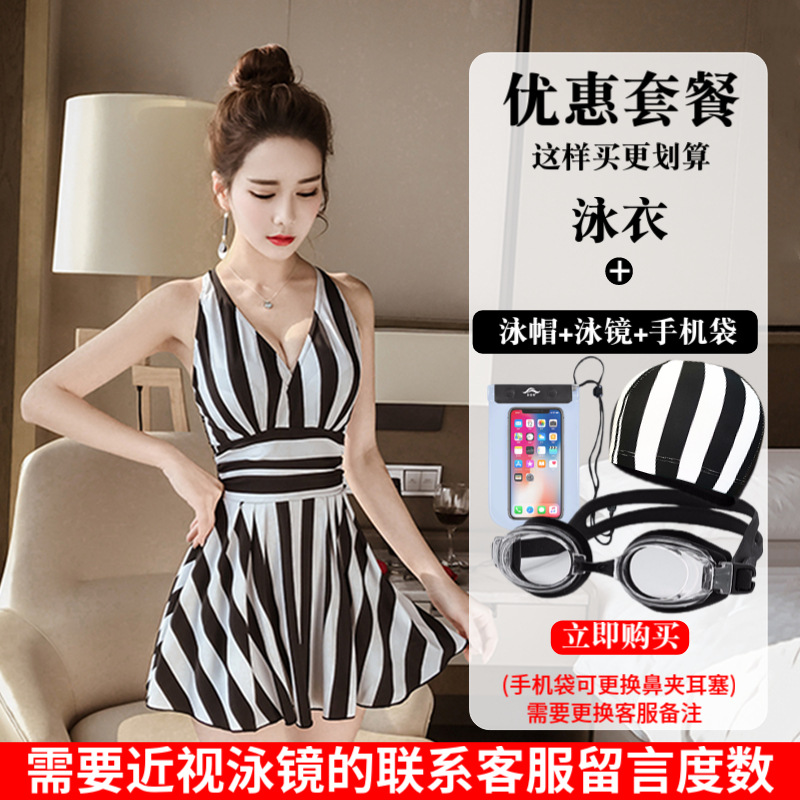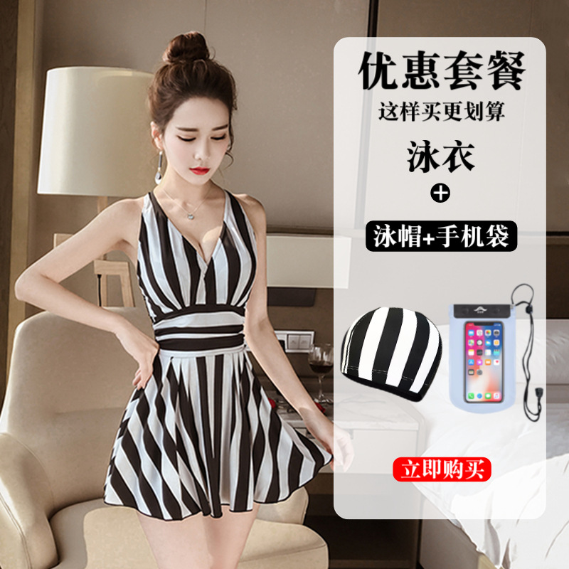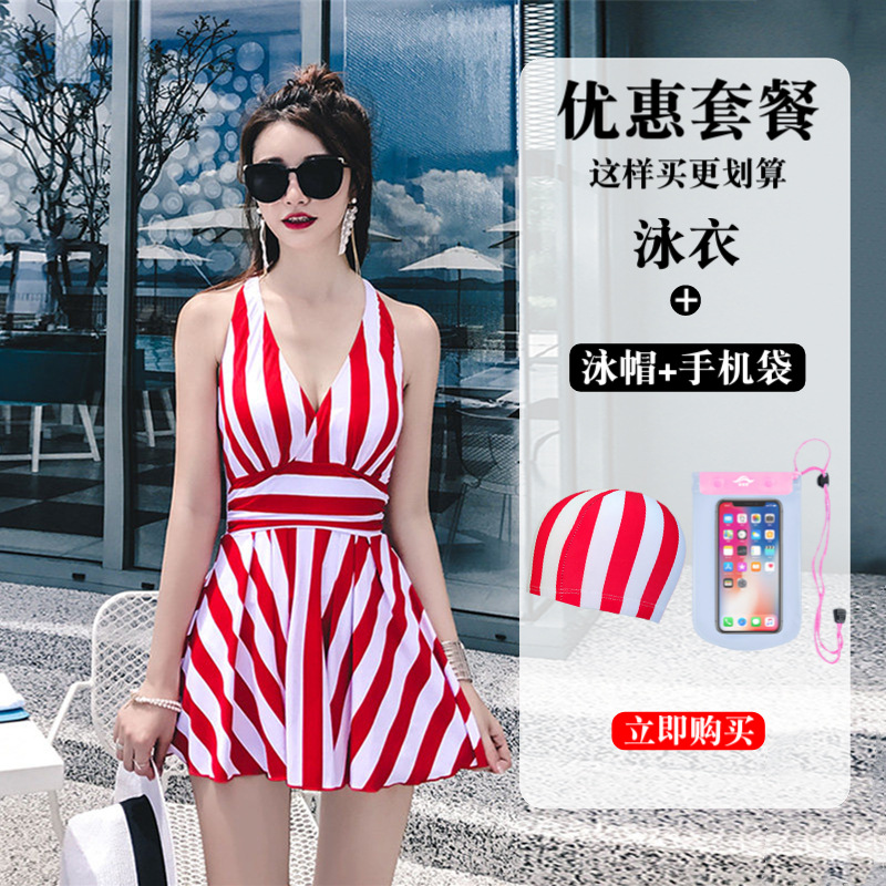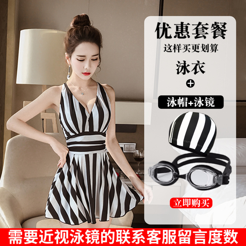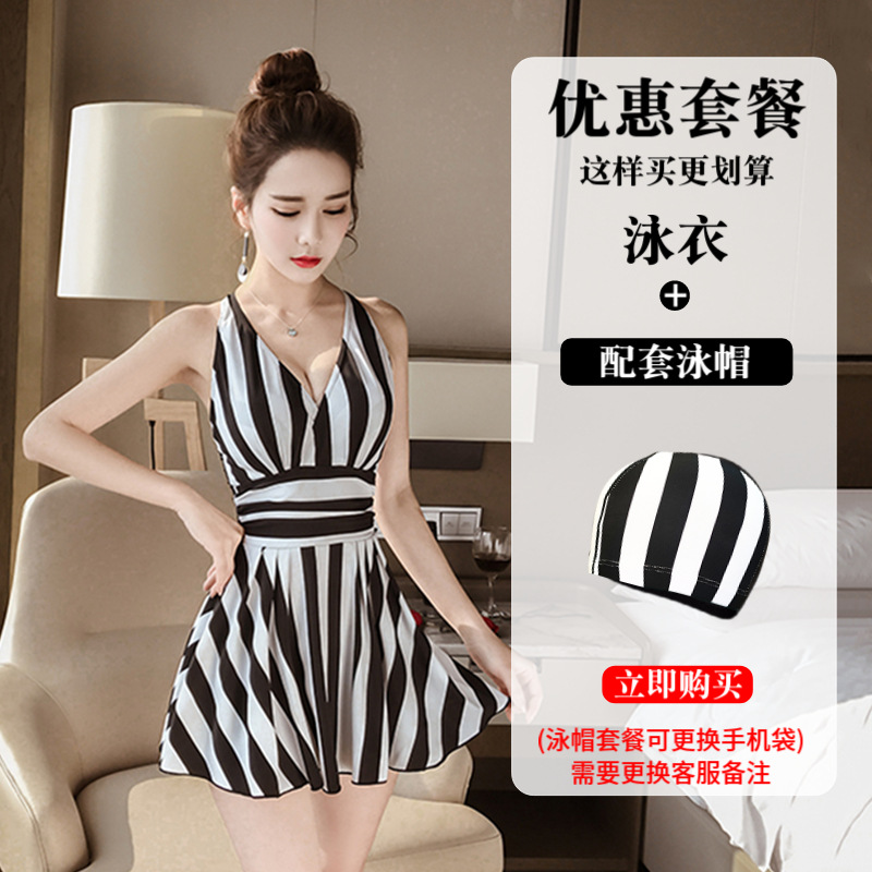 수영복 여성의 패션 스트라이프 새로운 원피스 스커트 배꼽 커버 슬림 플러스 사이즈 통통녀 보수적 인 비치 스파 수영복스토어 가기
