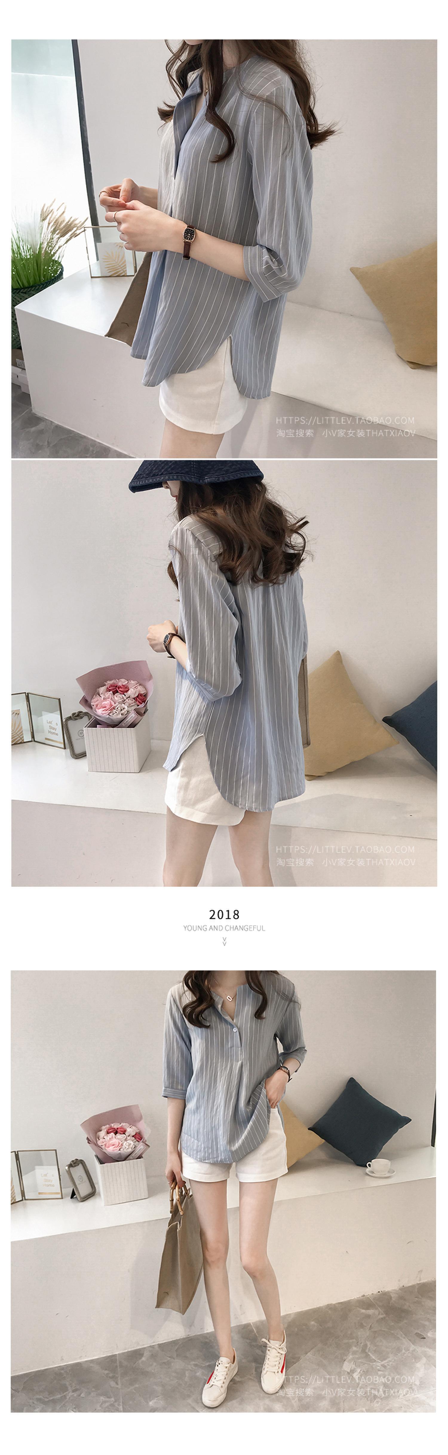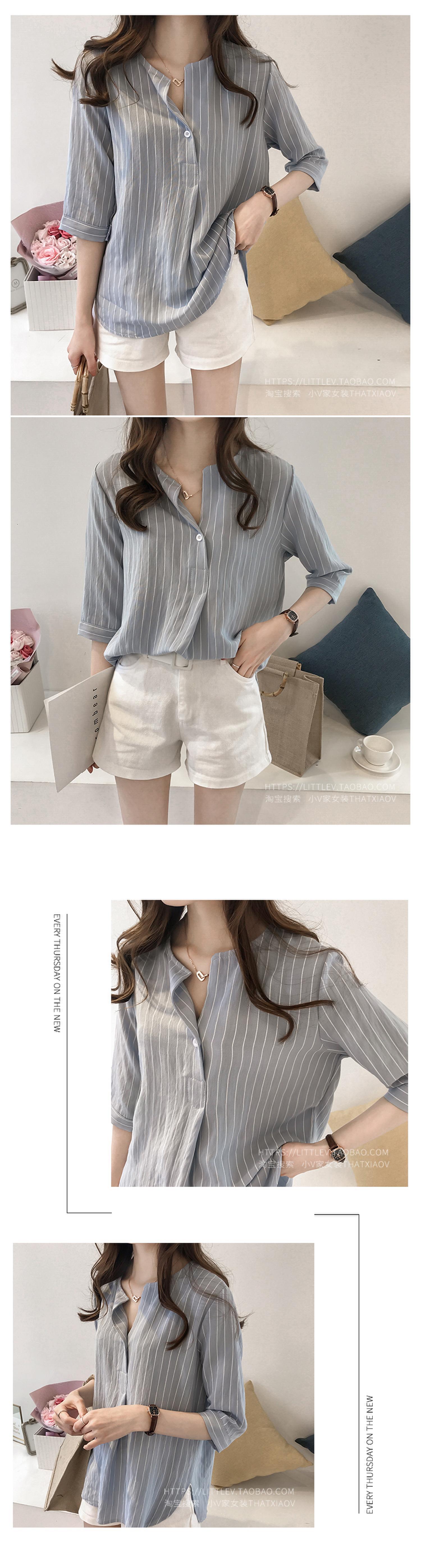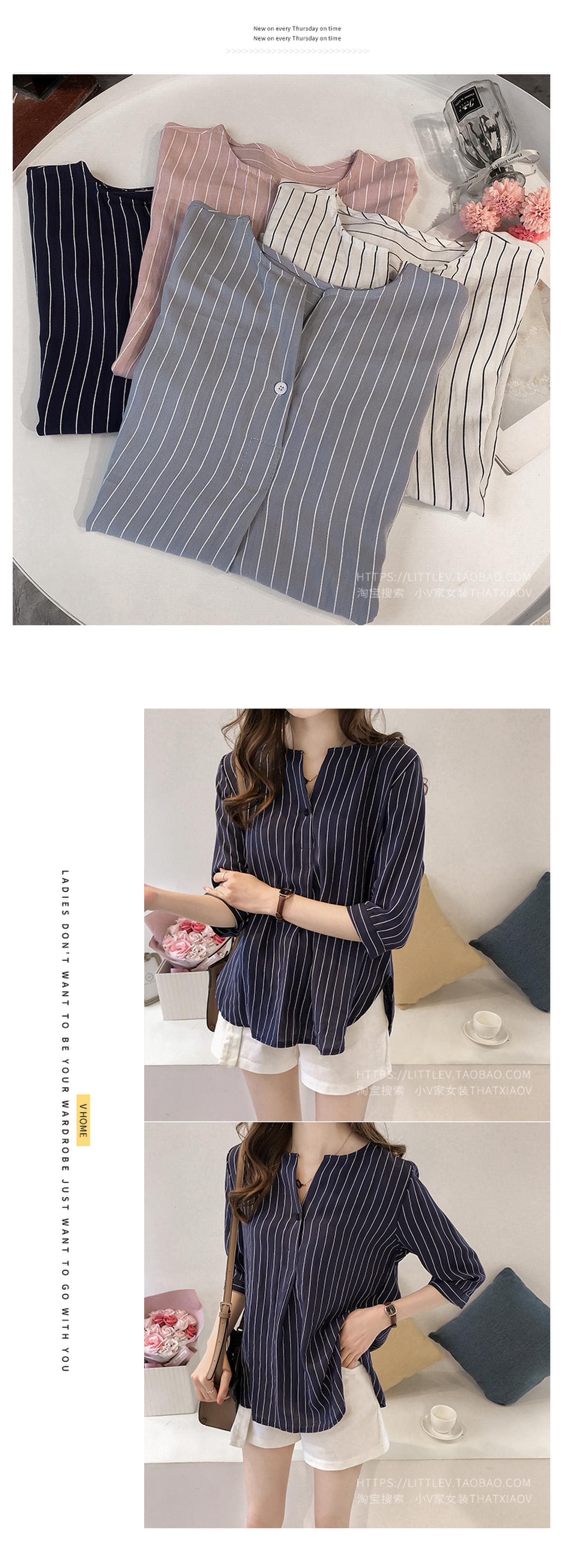 2024 새로운 여름 한국 스타일 패션 대형 라운드 넥 스트라이프 셔츠 여성 7부 소매 탑 루즈 캐주얼 셔츠스토어 가기