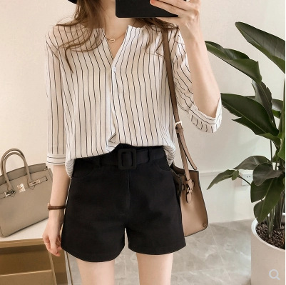 2024 새로운 여름 한국 스타일 패션 대형 라운드 넥 스트라이프 셔츠 여성 7부 소매 탑 루즈 캐주얼 셔츠