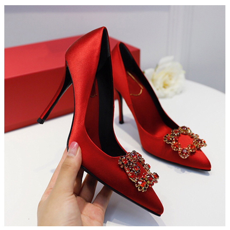 빨간색 웨딩 슈즈, 큐빅 장식 사각 버클, 웨딩드레스용 스틸레토, 미들힐, 뾰족코 신부 들러리 신발, 10cm 초하이힐스토어 가기