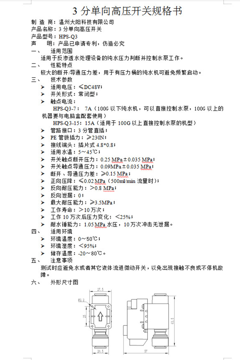 作用:适用于反渗透水处理设备的纯水压力判断,控制纯水机的开关机
