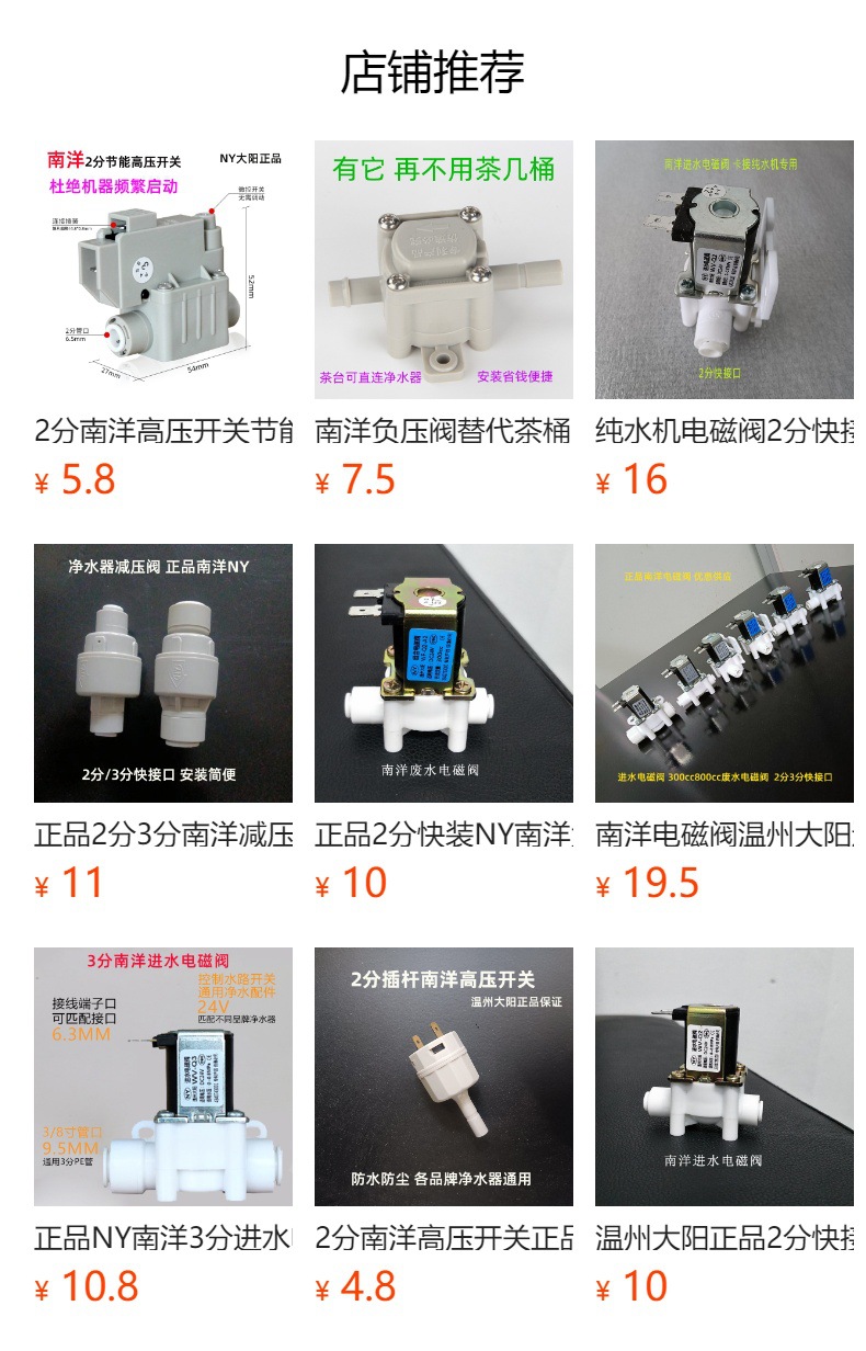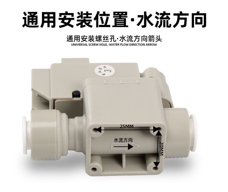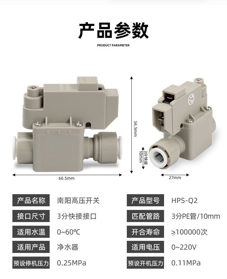 特点:避免频繁启动和无谓冲洗。接口为3分快接,可以接3分水管。比一般的普通高低压开关安装更方便。免去3分螺母,安装更省力省心。