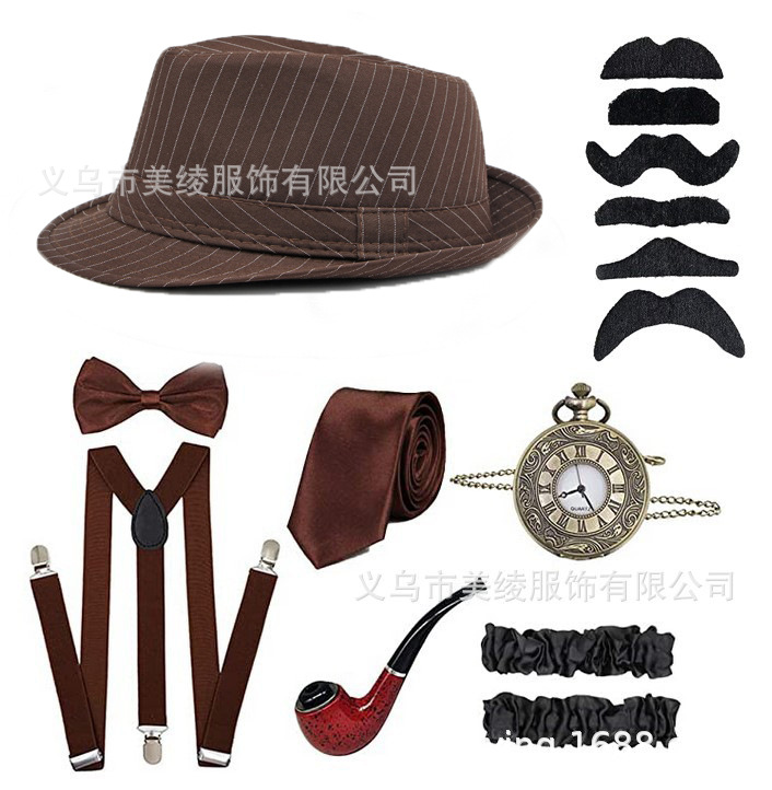 1920년대 레트로 모자 남성용 개츠비 무도회 파티 모자 담배 파이프 회중시계 뒷끈 넥타이 세트 해외배송