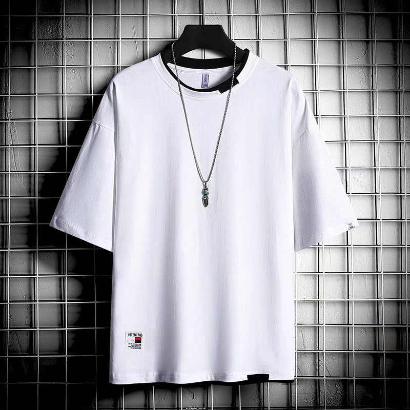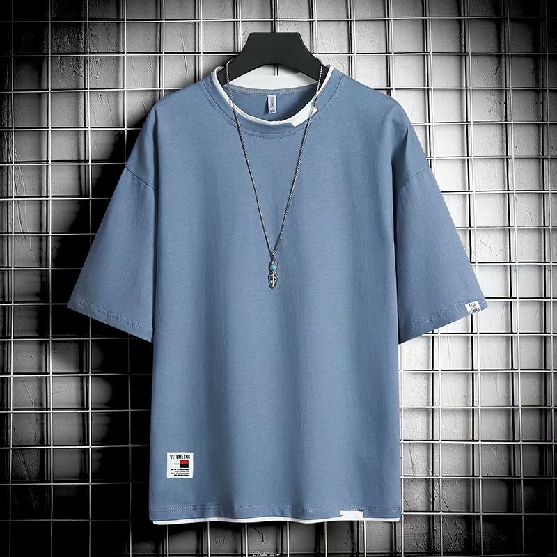 2023 여름 반팔 티셔츠 남성용 홍콩 스타일 트렌디베이스 티셔츠 학생 느슨한 시원한 라운드 넥 티셔츠 남성용 의류스토어 가기