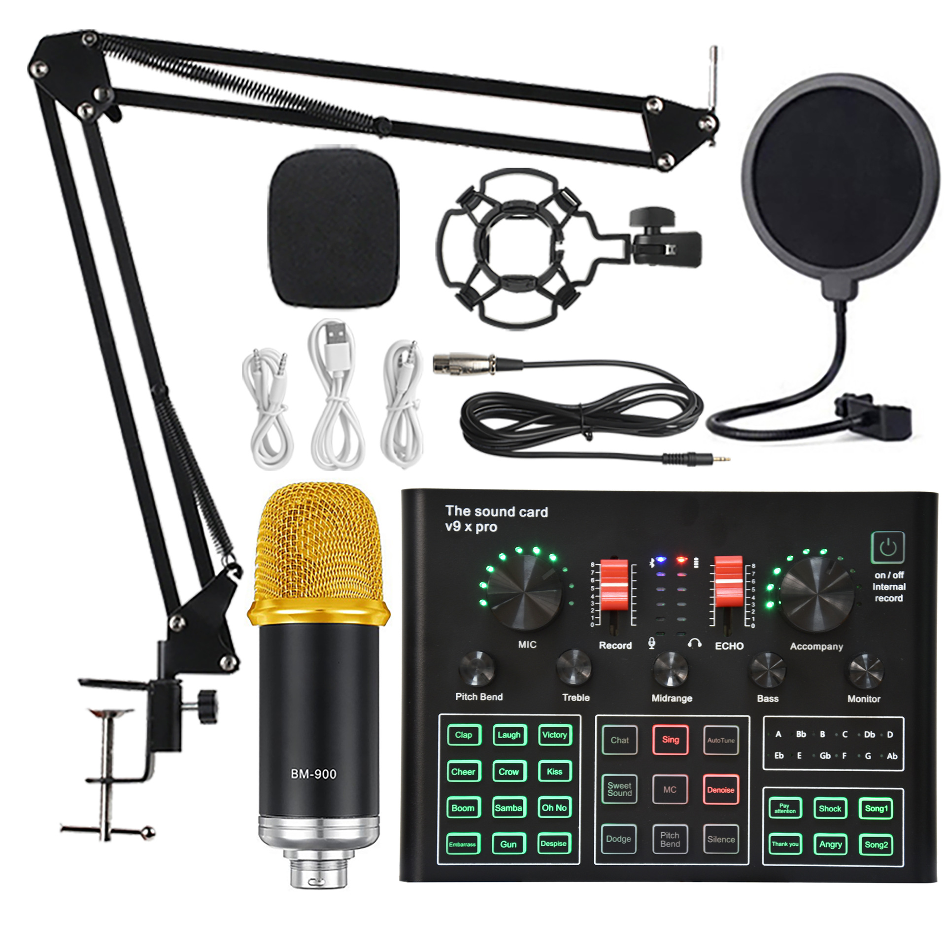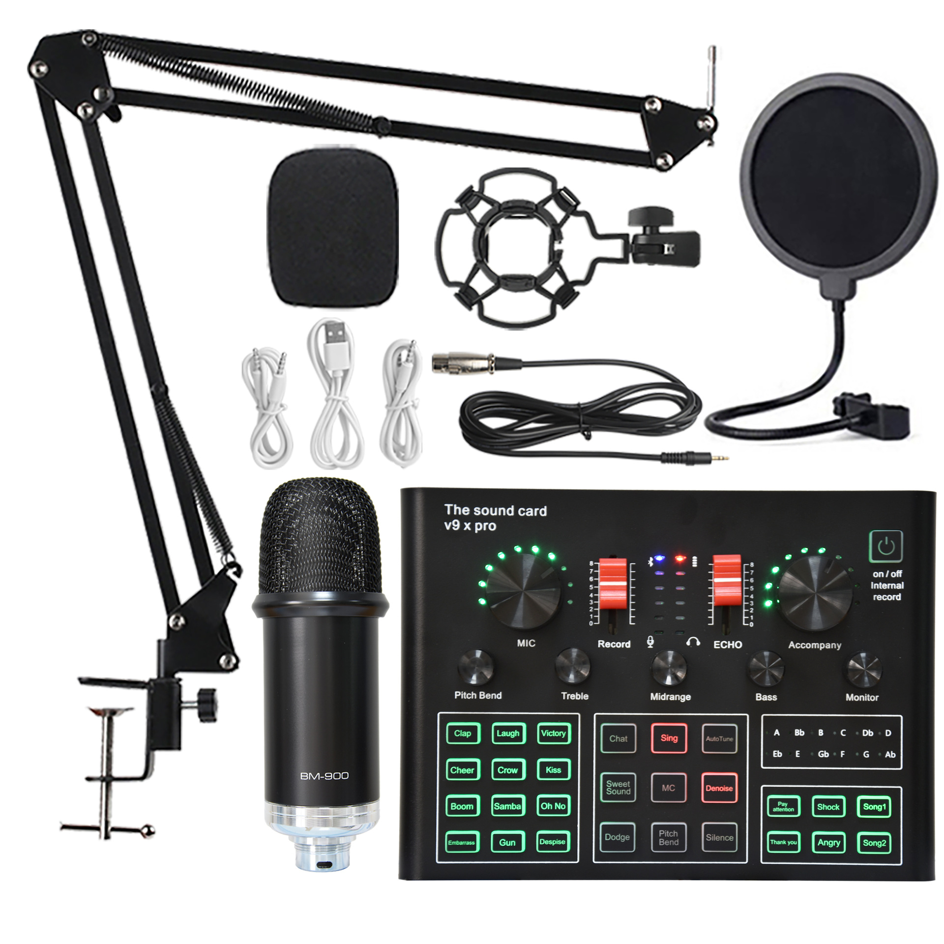 • BM900 블랙 + V9XPRO 사운드 카드 + 캔틸레버 브래킷 + 금속 베이스 + 대형 블로우아웃 스크린 + 쇼크 마운트 + 스폰지 볼 + 마이크 케이블