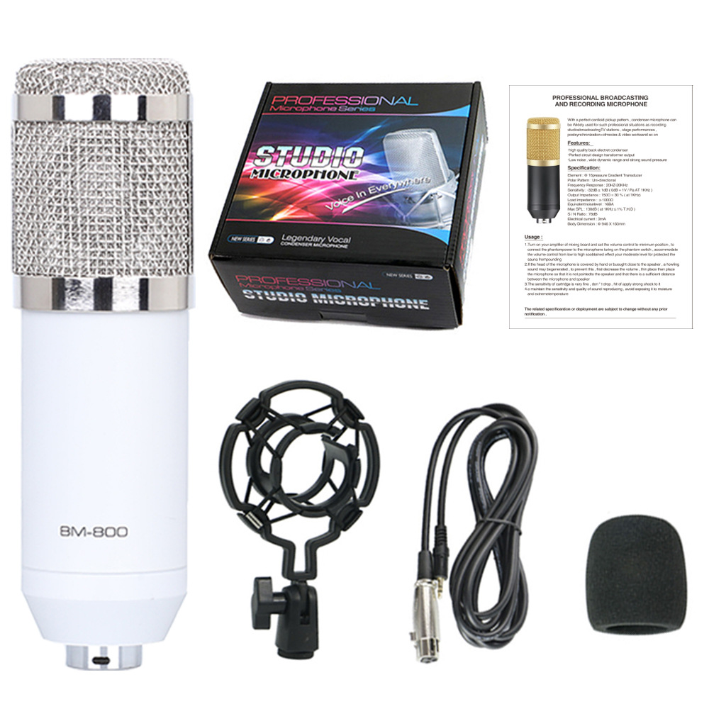 • BM900 실버 + V9XPRO 사운드 카드 + 캔틸레버 브래킷 + 금속 베이스 + 대형 블로우아웃 스크린 + 쇼크 마운트 + 스폰지 볼 + 마이크 케이블