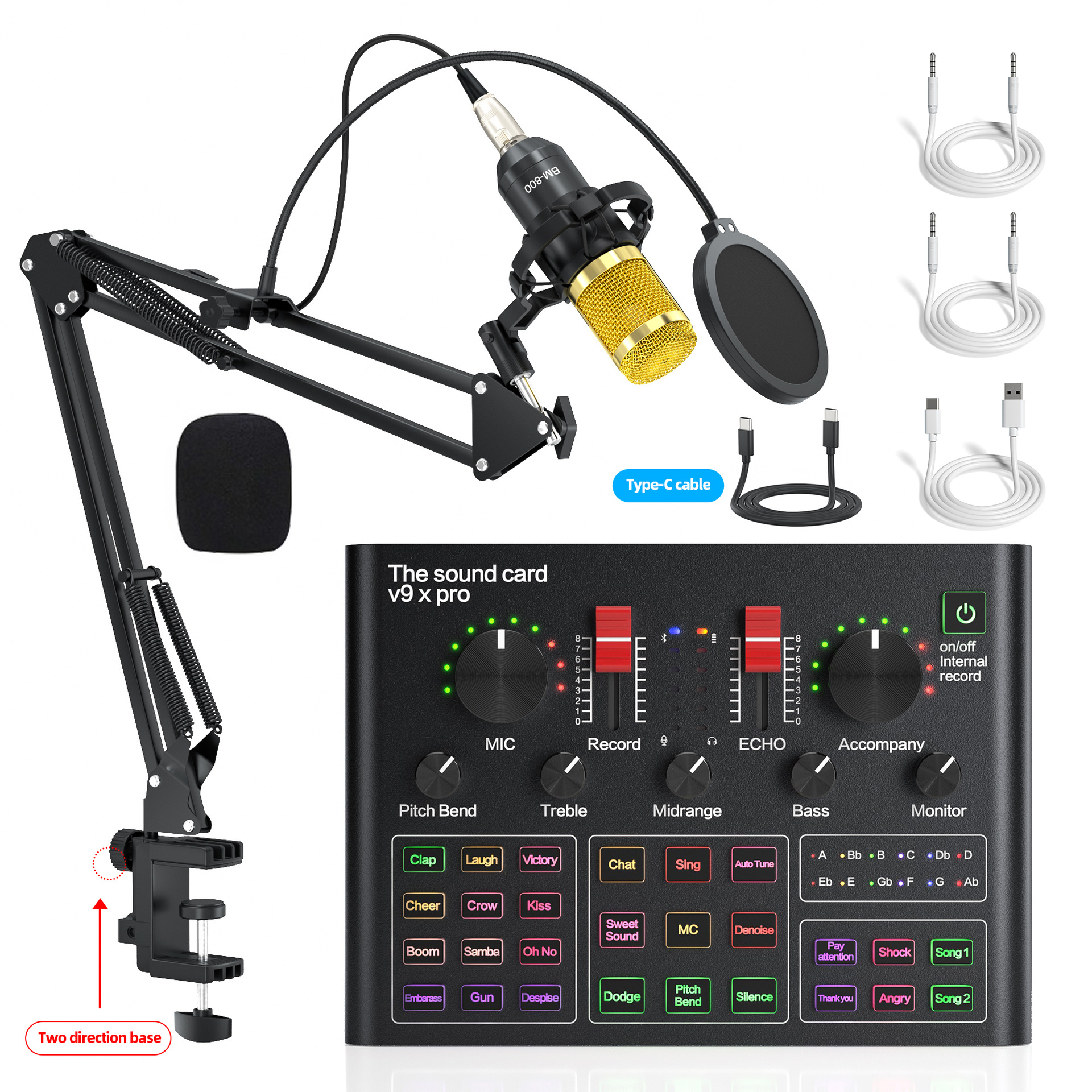 • 블랙 골드 BM800+V9XPRO 사운드 카드+양방향 캔틸레버 브래킷+대형 블로우아웃 스크린+쇼크 마운트+스펀지 볼+마이크 케이블+TYPE-C 케이블