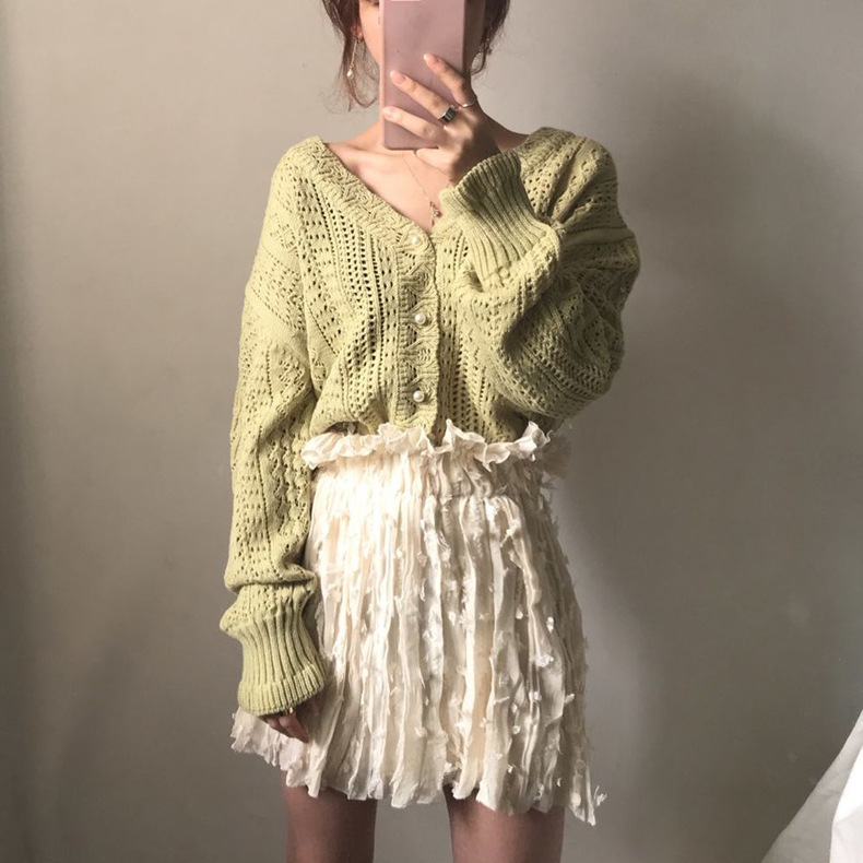 이른 가을 새로운 한국 세련된 빈티지 중공 울 코트 게으른 스타일 크로 셰 뜨개질 스웨터 V-넥 니트 가디건 여성용
