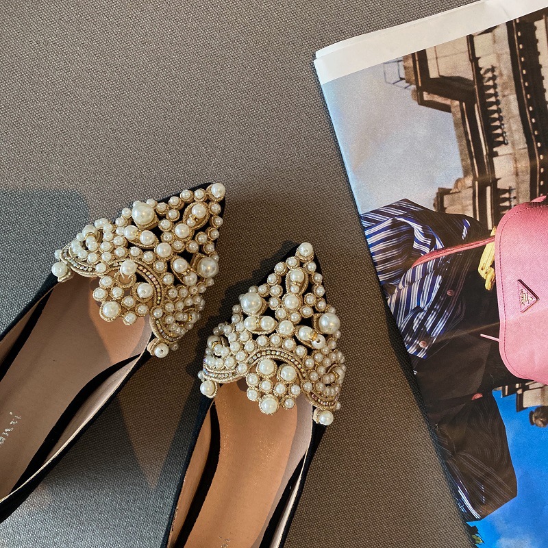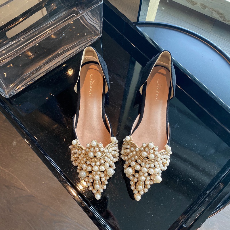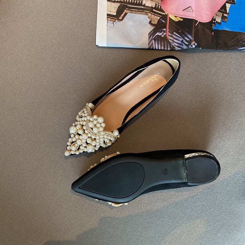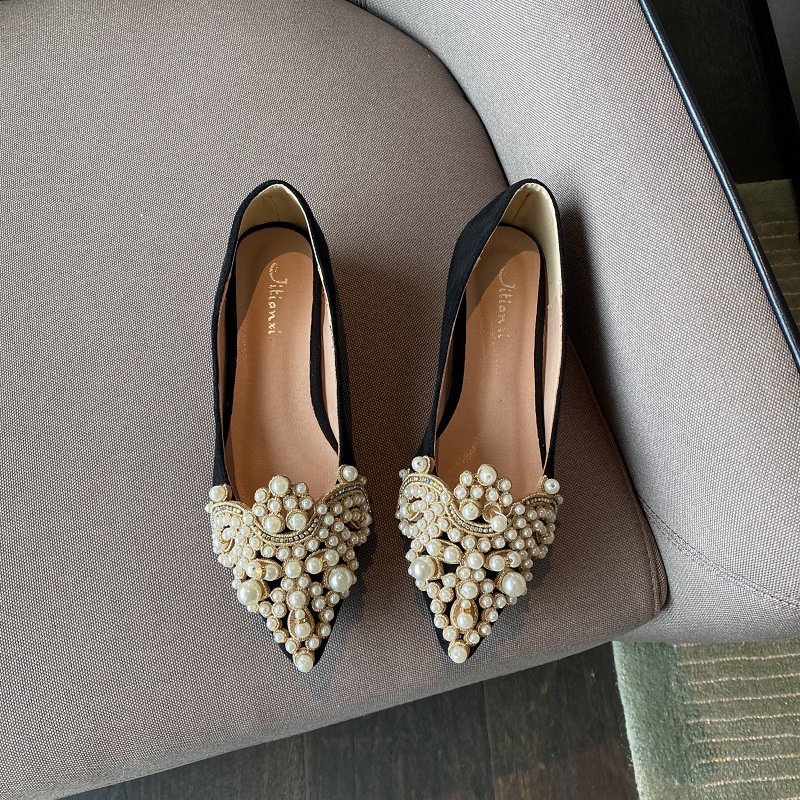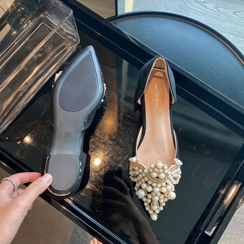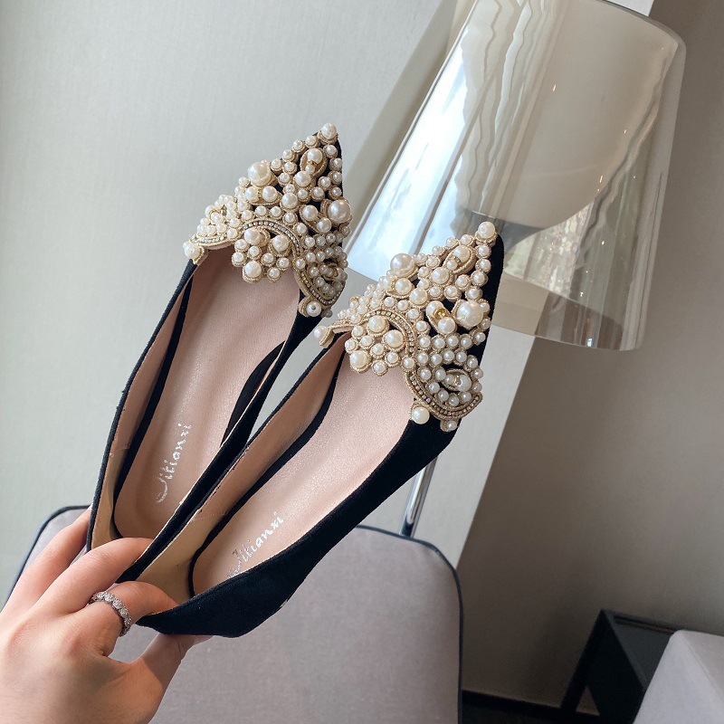 봄 2025 새로운 한국 스타일 요정 스타일 포인팅 플랫 레트로 펄 라인스톤 싱글 신발 대형 신발 414243