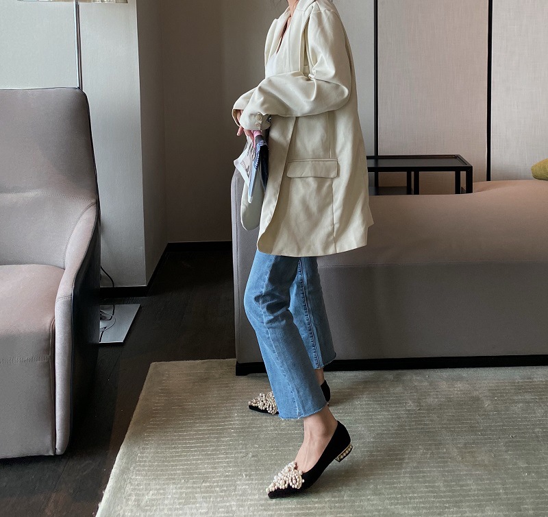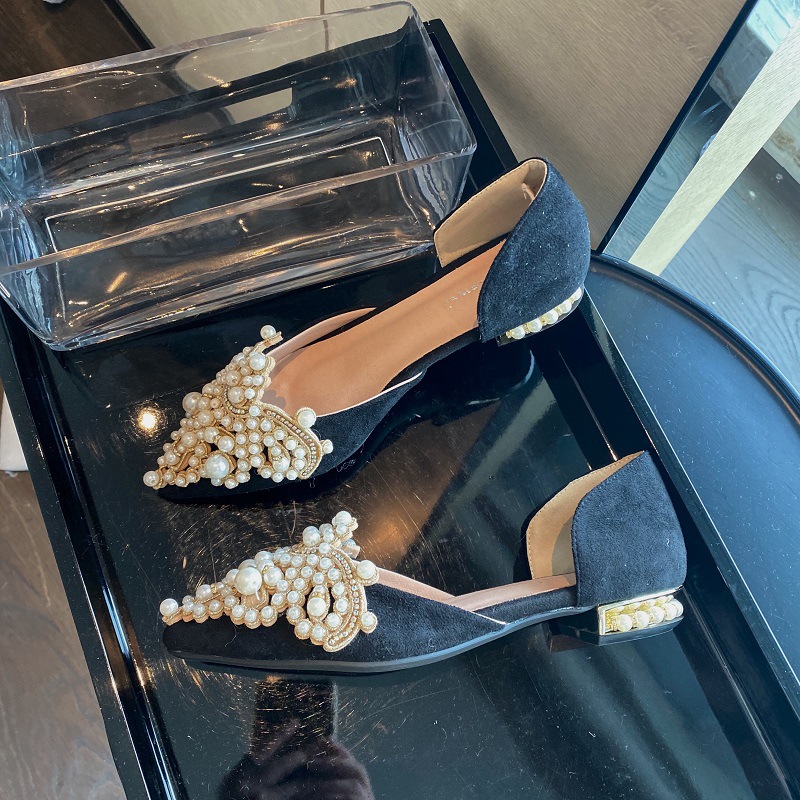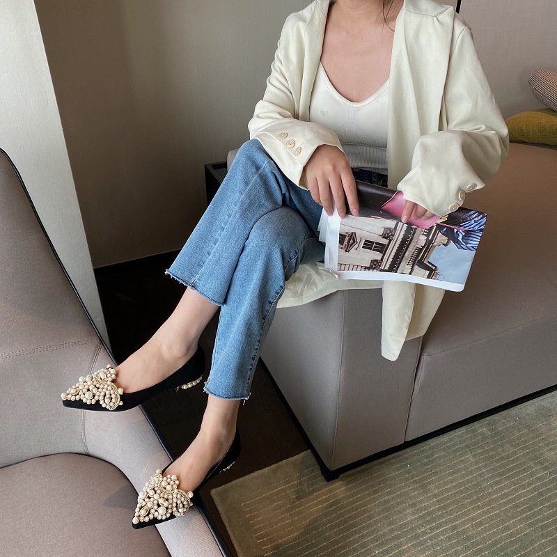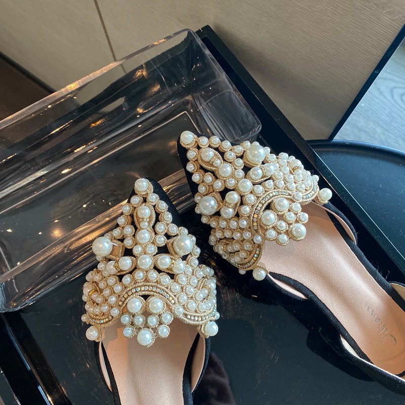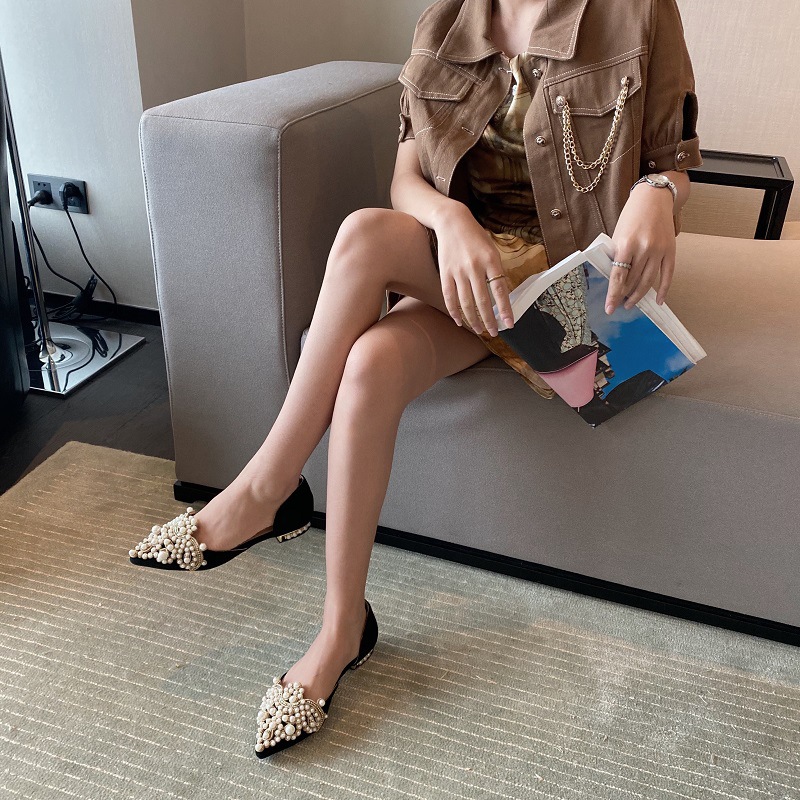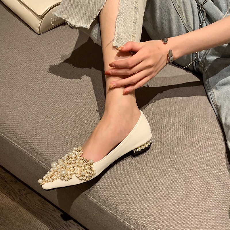 봄 2025 새로운 한국 스타일 요정 스타일 포인팅 플랫 레트로 펄 라인스톤 싱글 신발 대형 신발 414243
