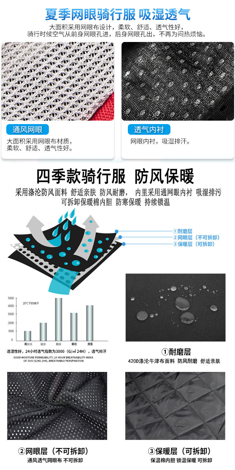 【四季款骑行服:四季通用】面料使用涤沦布料,内有可拆卸的保暖棉内胆.四季款防泼水,是不能当作雨衣使用哦~赠送防风防水外套