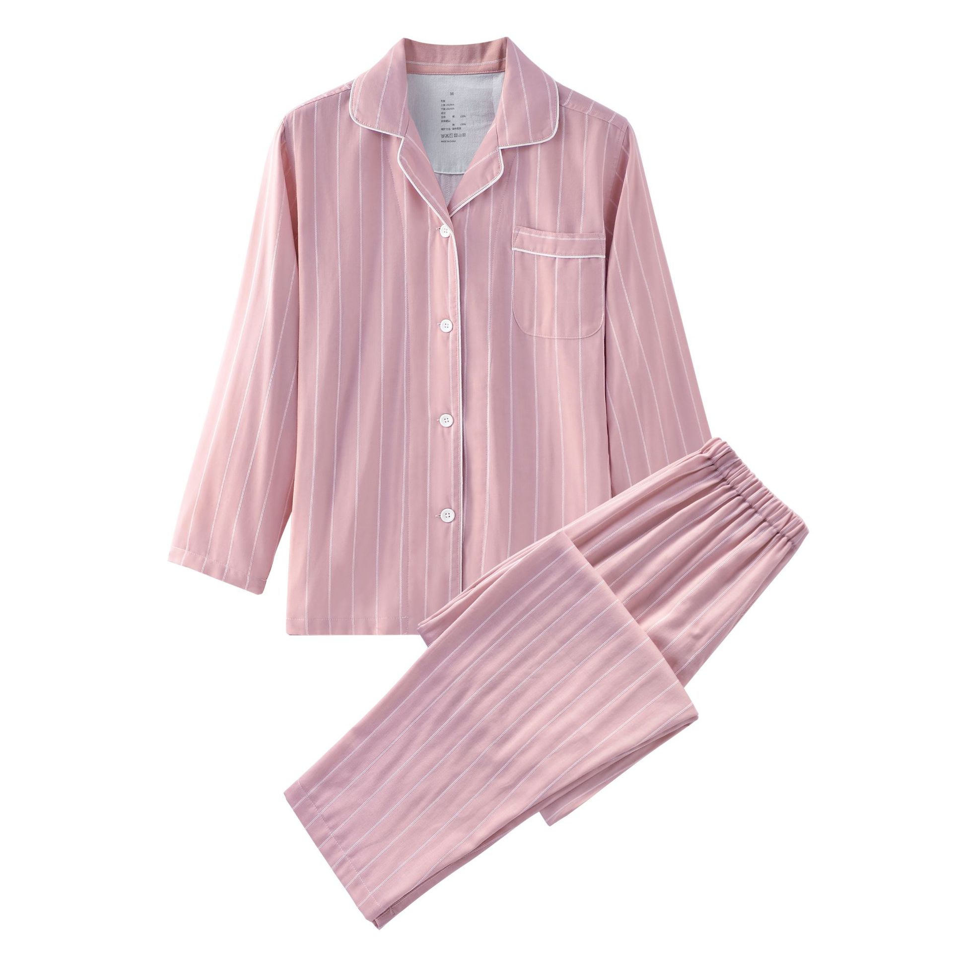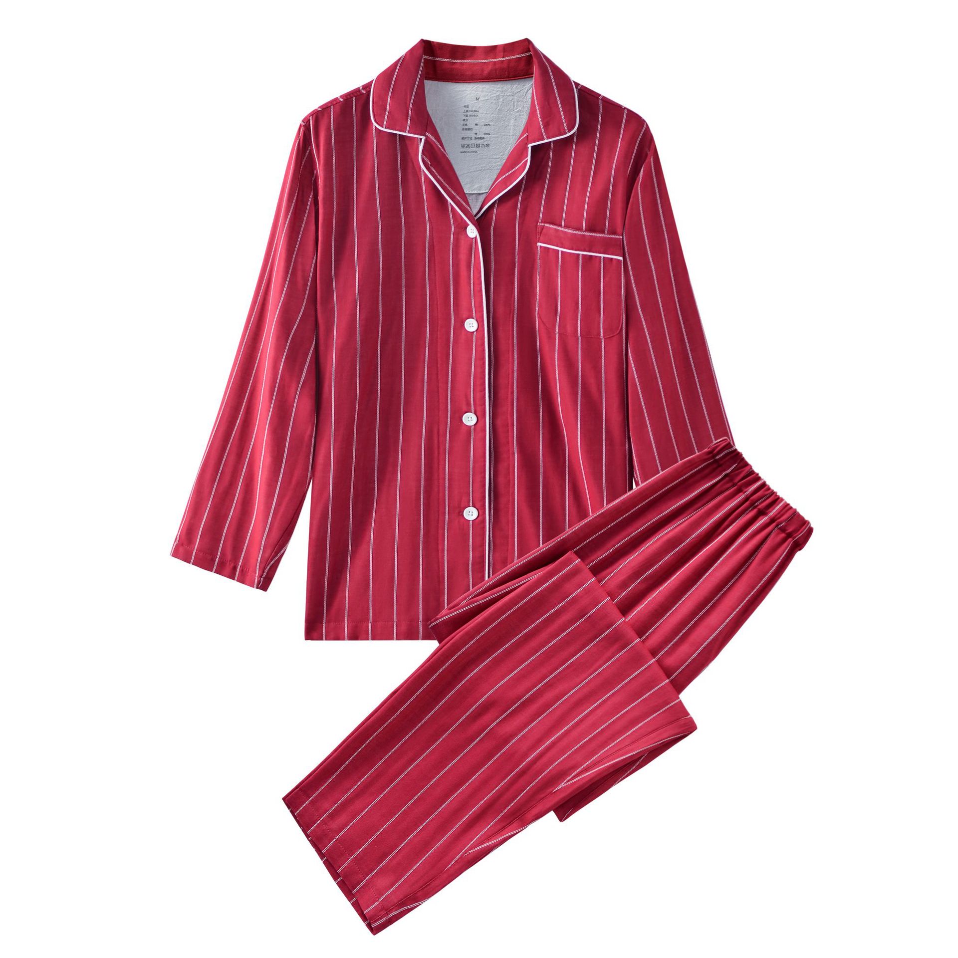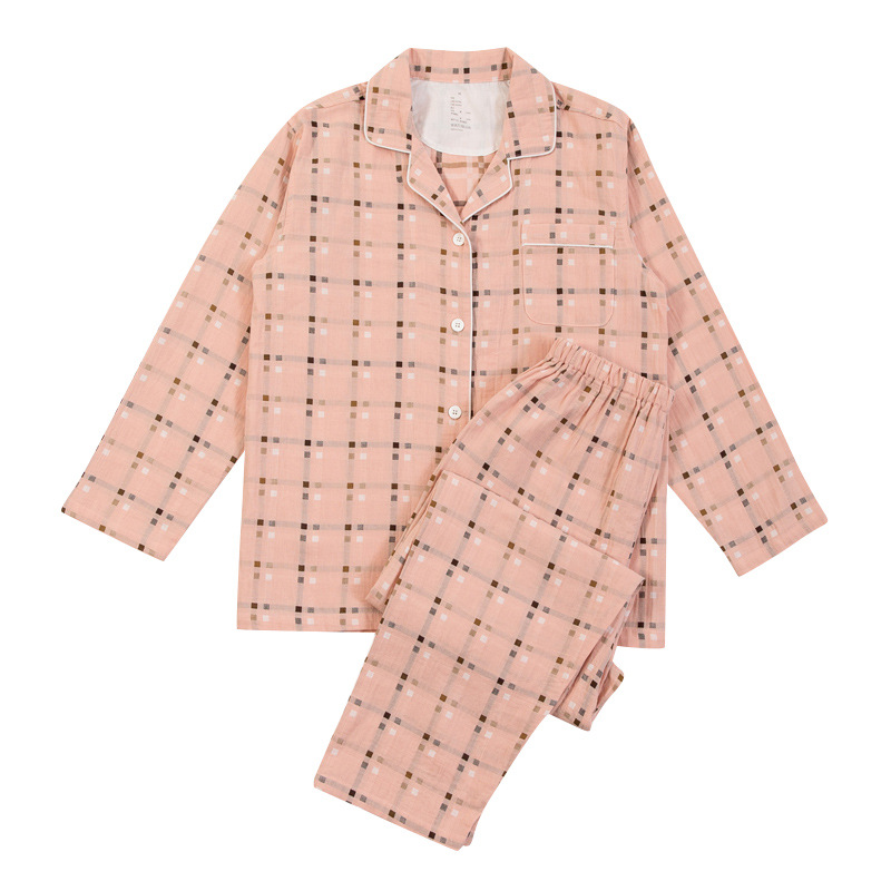 신상 순면 이중 거즈 잠옷 심플한 격자무늬 스트라이프 무봉제 봄가을 긴팔 남녀 커플 홈웨어 세트