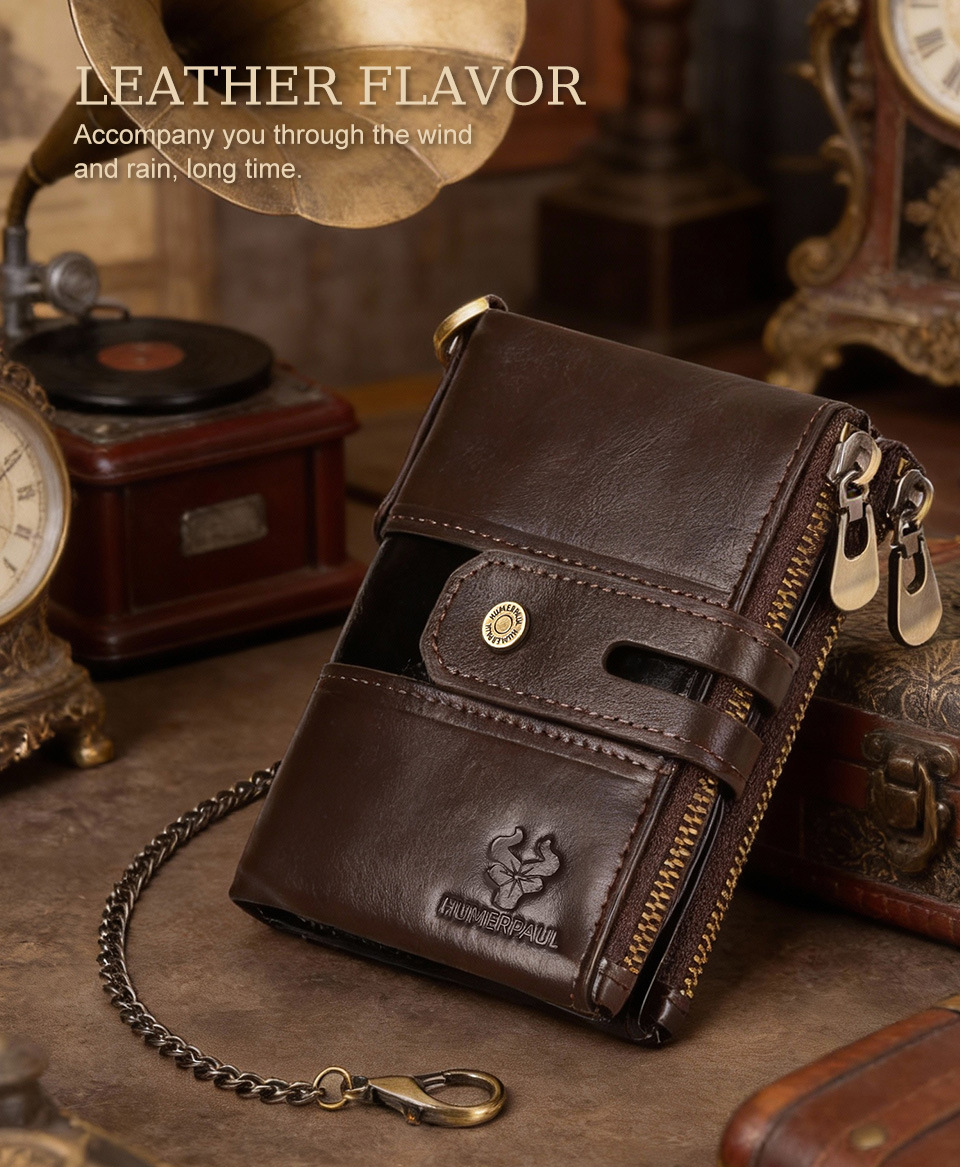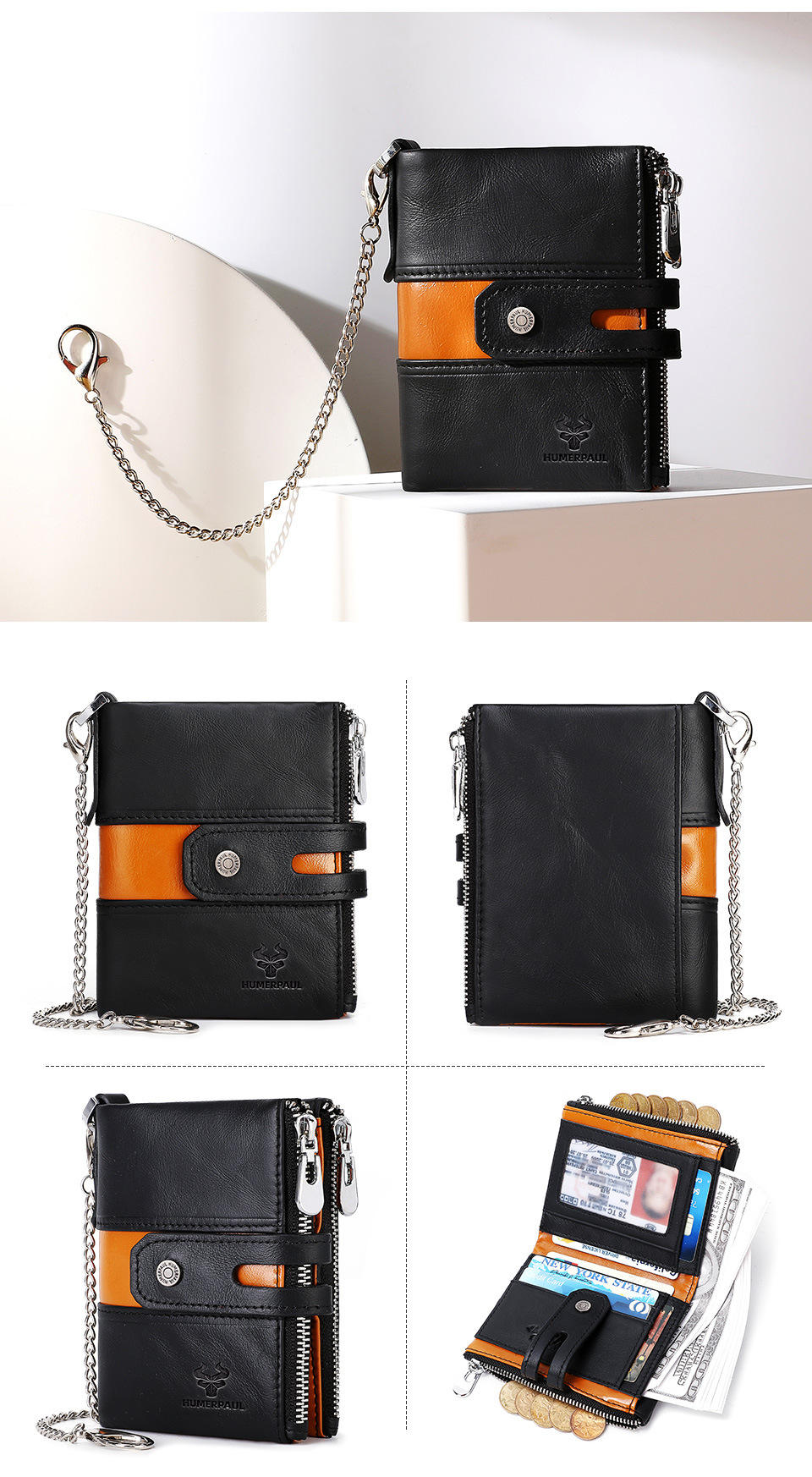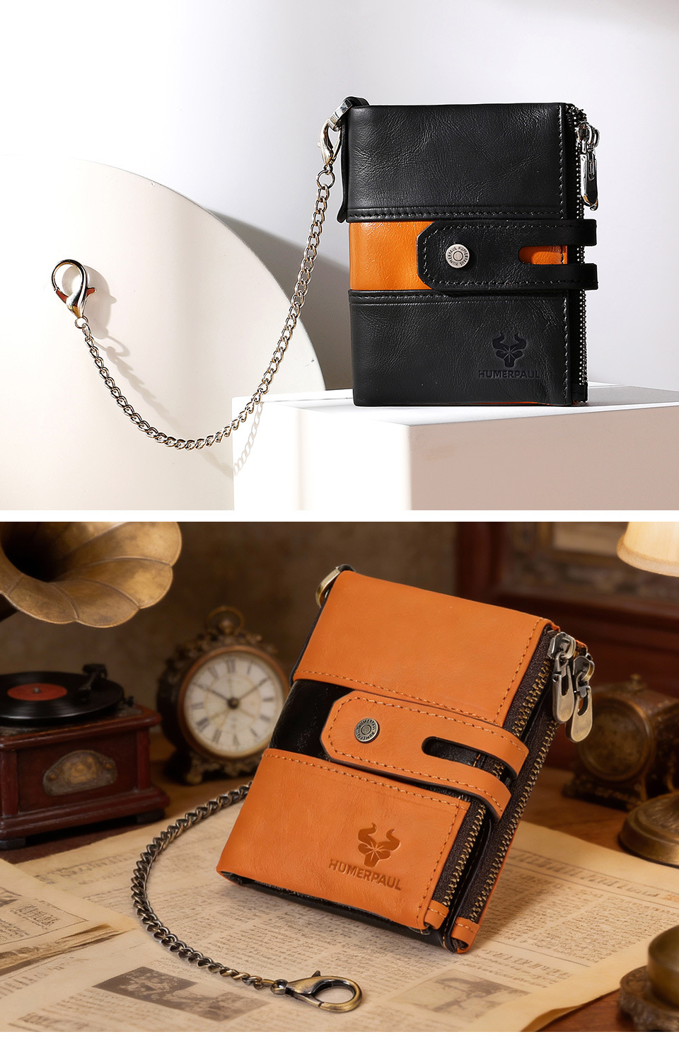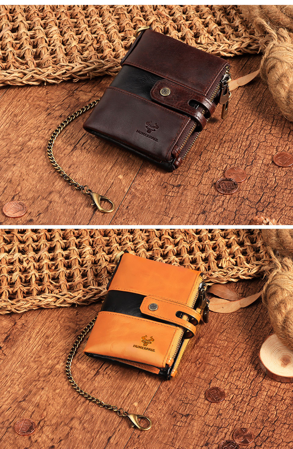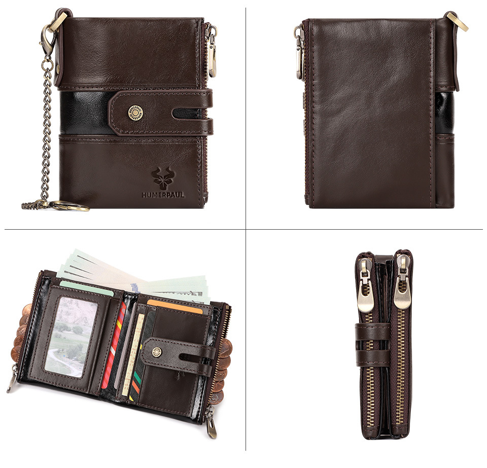 허머 폴 남성 가죽 지갑 복고풍 간단한 동전 지갑 더블 지퍼 첫 번째 레이어 소 가죽 RFID 지갑 도매