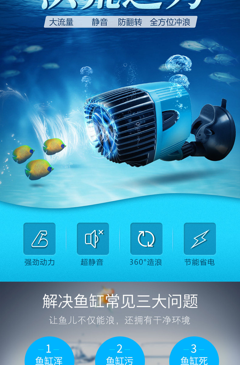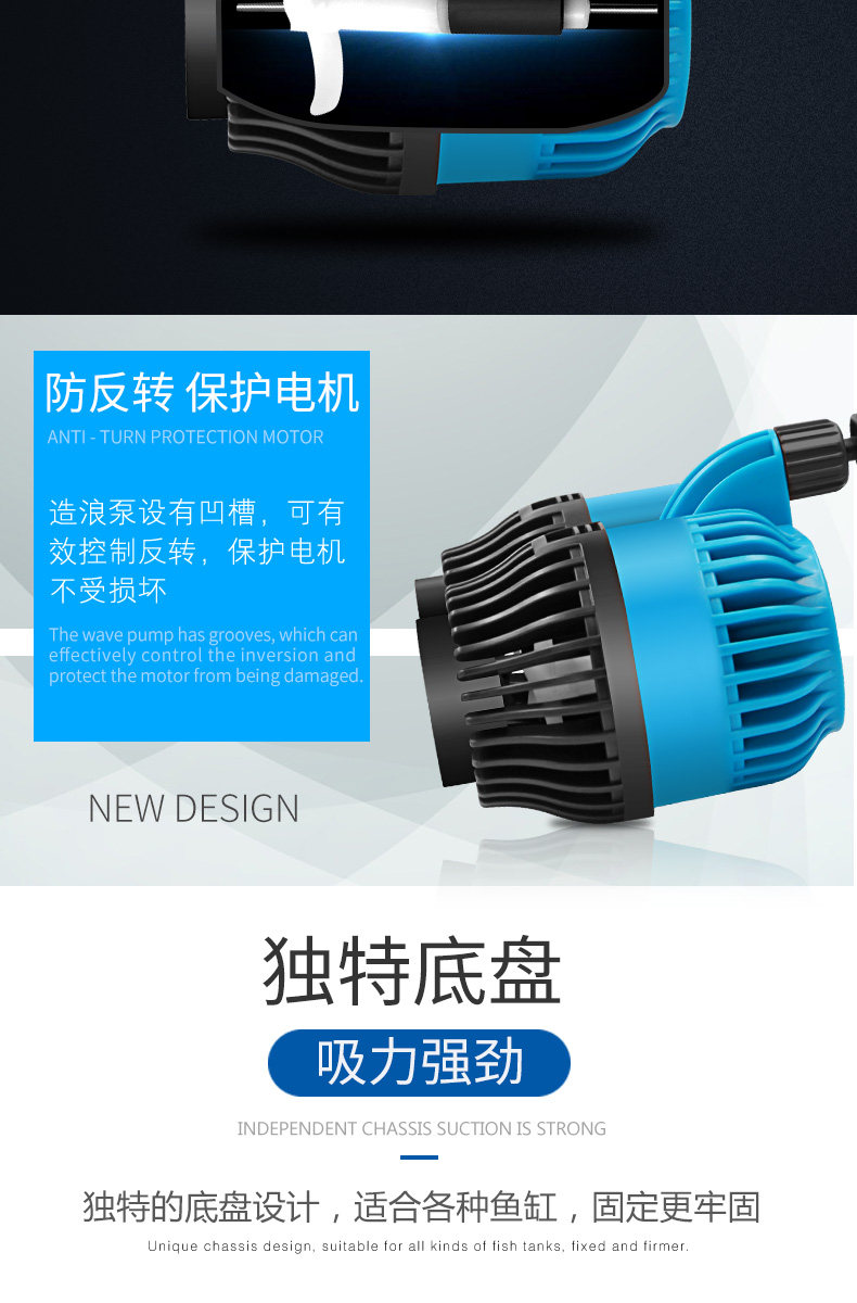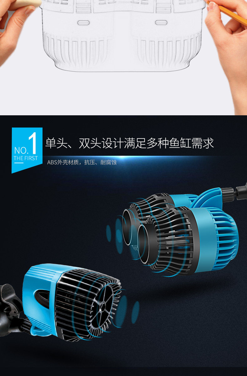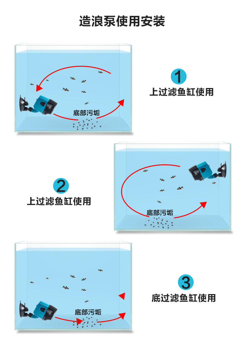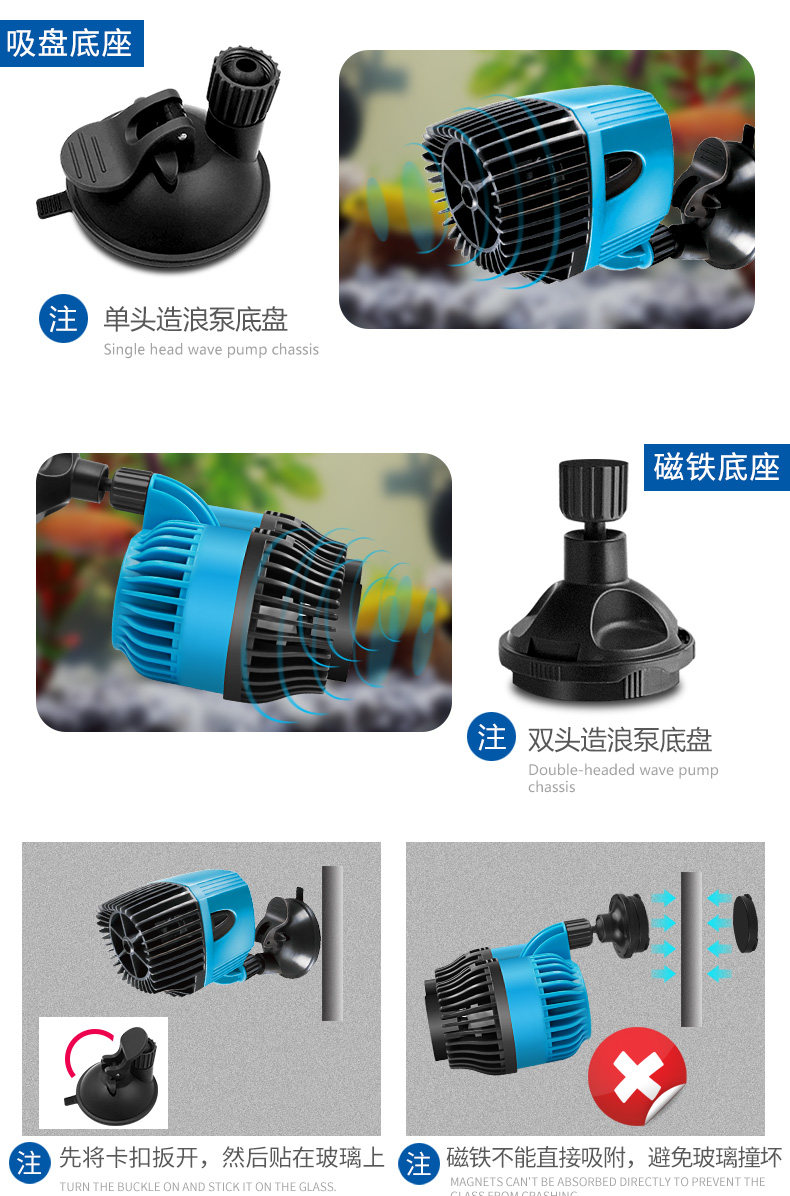 温馨提示:造浪泵使用时水泵电机如不在水中运转,转子不会平衡,是绝对有噪音的而且长时间会损害轴心,使用时请完全浸入水中。