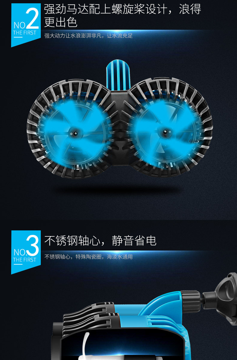 产品说明:此款造浪泵电源线长2米左右 采用高强度耐磨不锈钢轴心,高强度、长寿命