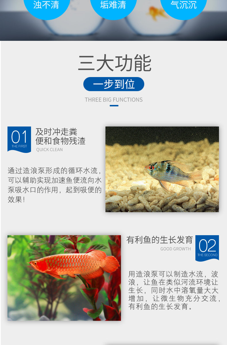 1.造出的水流将鱼便和缸底杂物吹向潜水泵,使过滤更彻底,保证了水质,省去了虹吸和手动向潜水泵驱赶缸底杂物、鱼便的麻烦,并且比手动 虹吸更彻底。