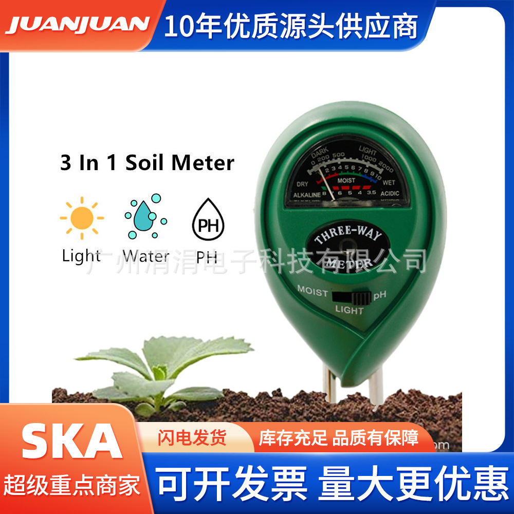 这是专供出口的产品,不需要电源,集叁种功能于一身,可以测量土壤的湿度PH度植物光合作用所需的太阳光的强度。使用方便、品质优良。