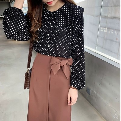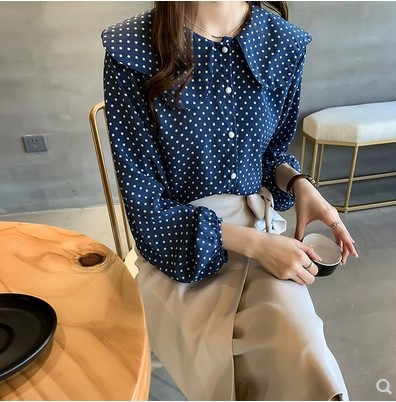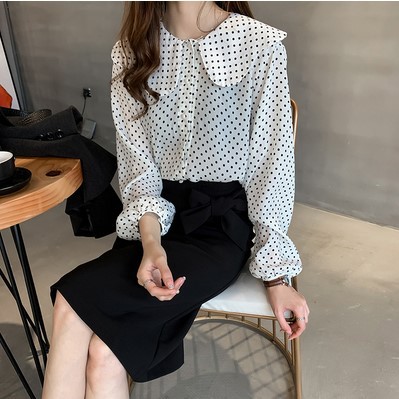 달콤한 인형 칼라 웨이브 도트 쉬폰 셔츠 여자의 긴 소매 탑 플러스 사이즈 베이스 셔츠 BL #3450스토어 가기