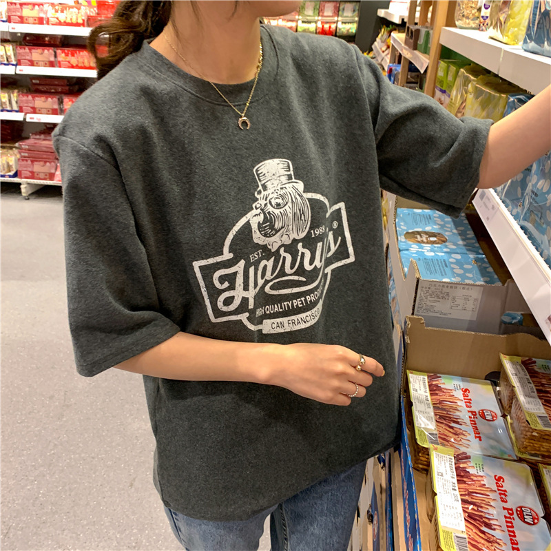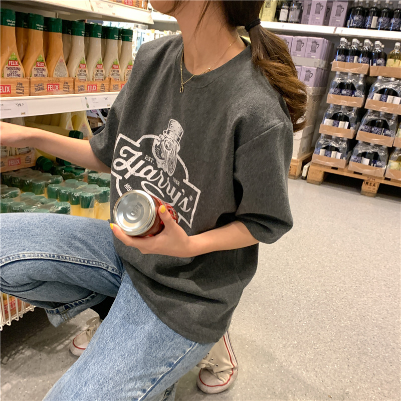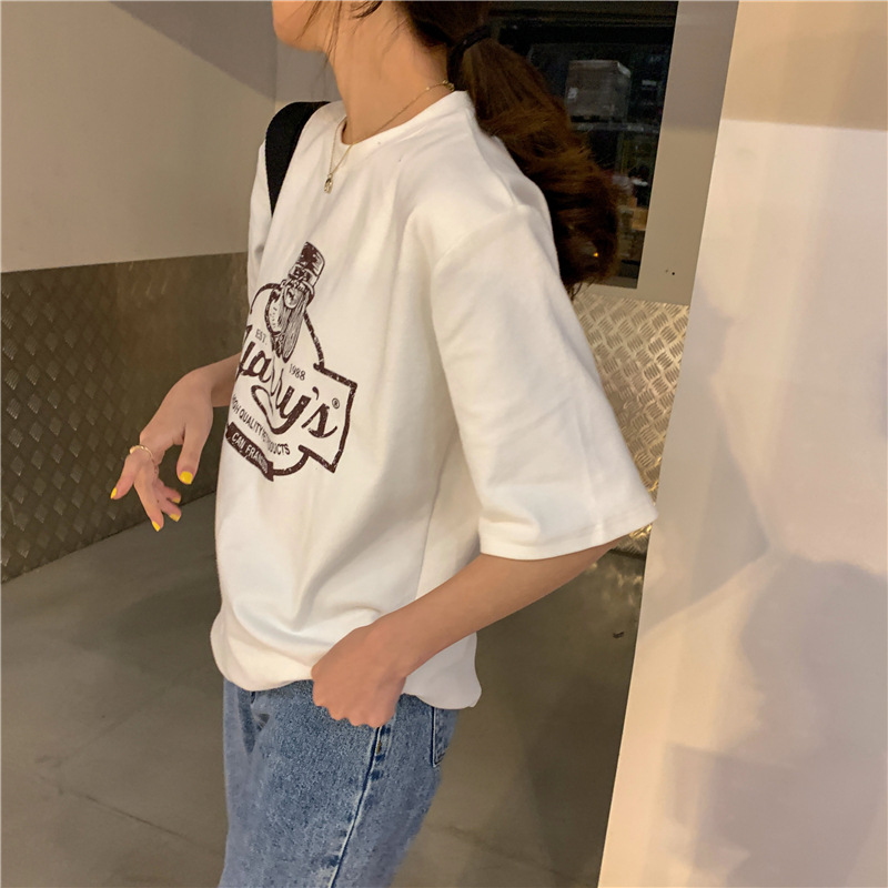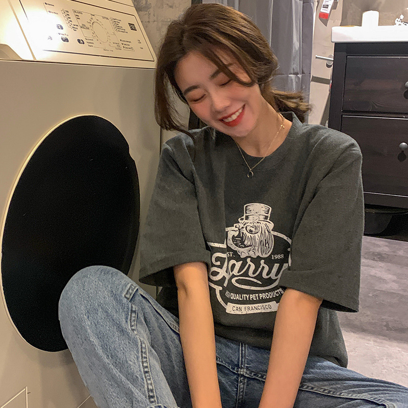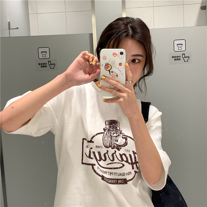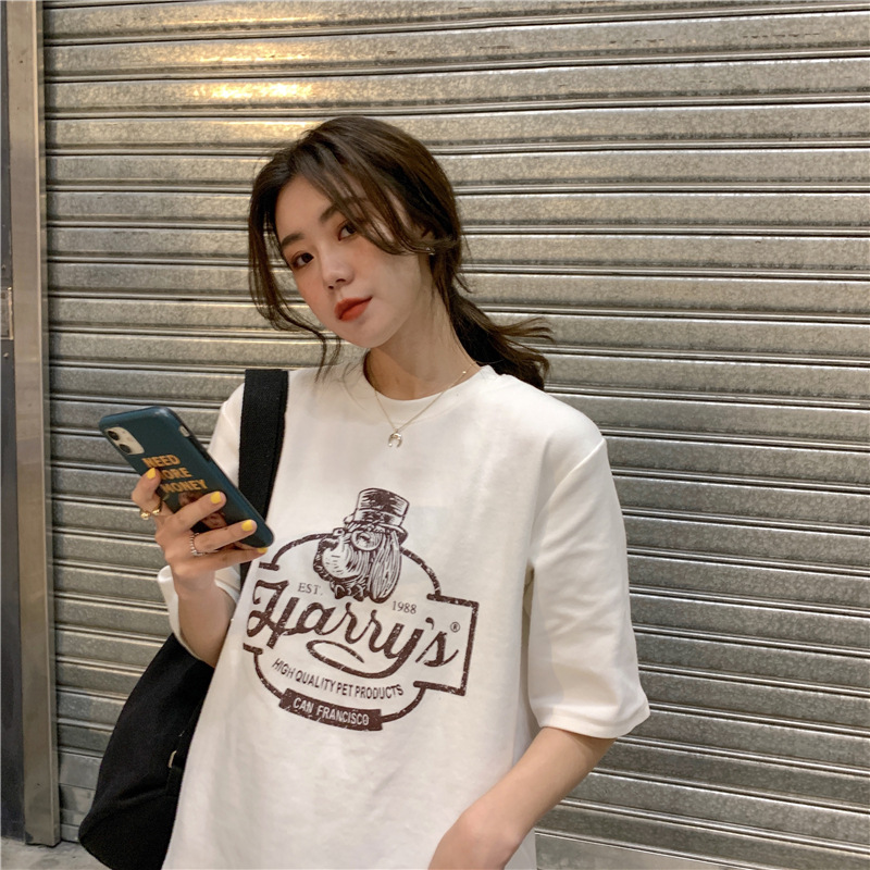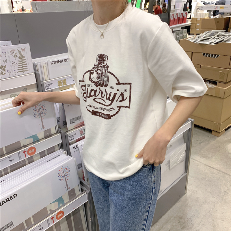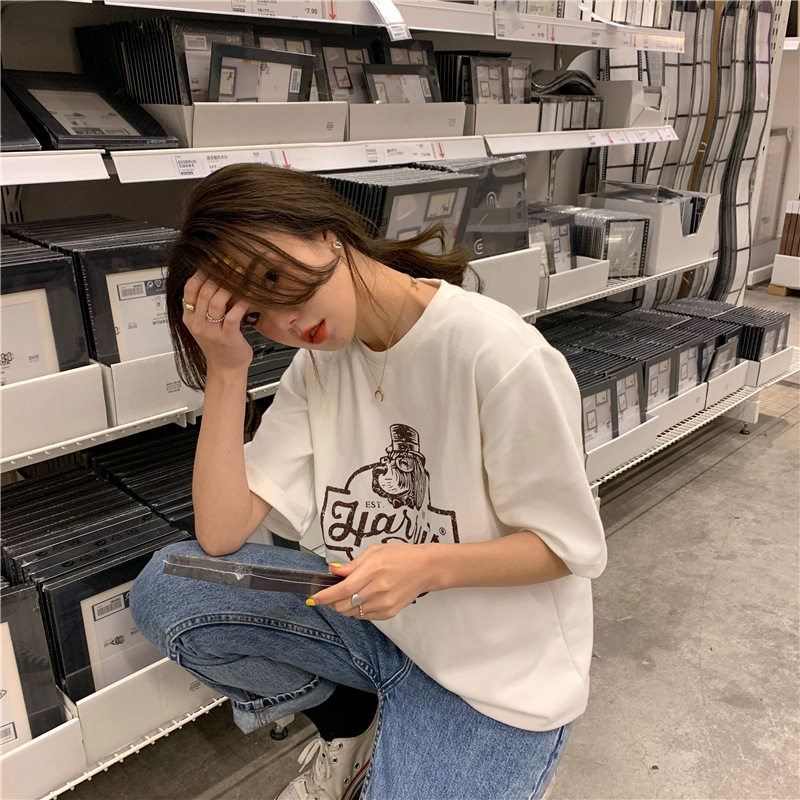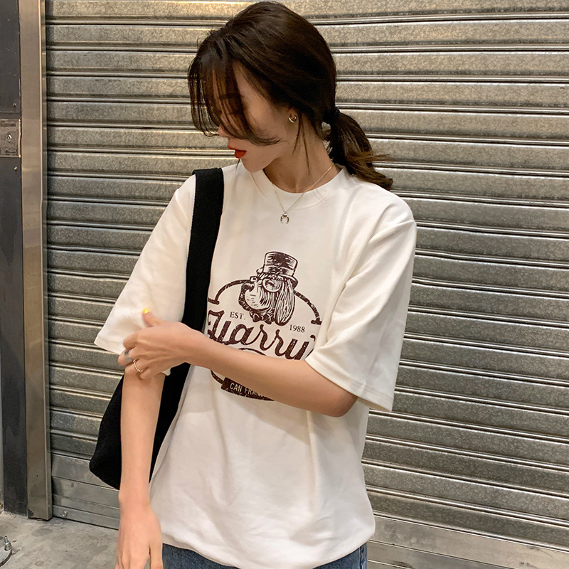 2023 여름 한국 스타일 BF 스타일 루즈한 올매치 프린트 학생 반팔 티셔츠 여성 캐주얼 홍콩 스타일 탑 인 트렌디스토어 가기