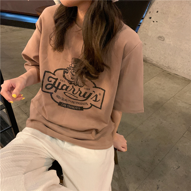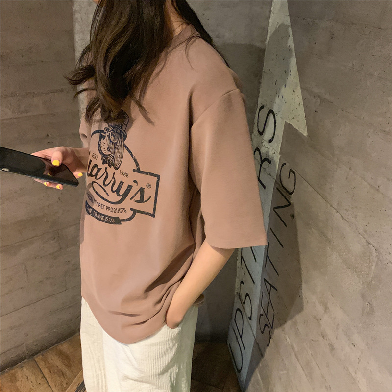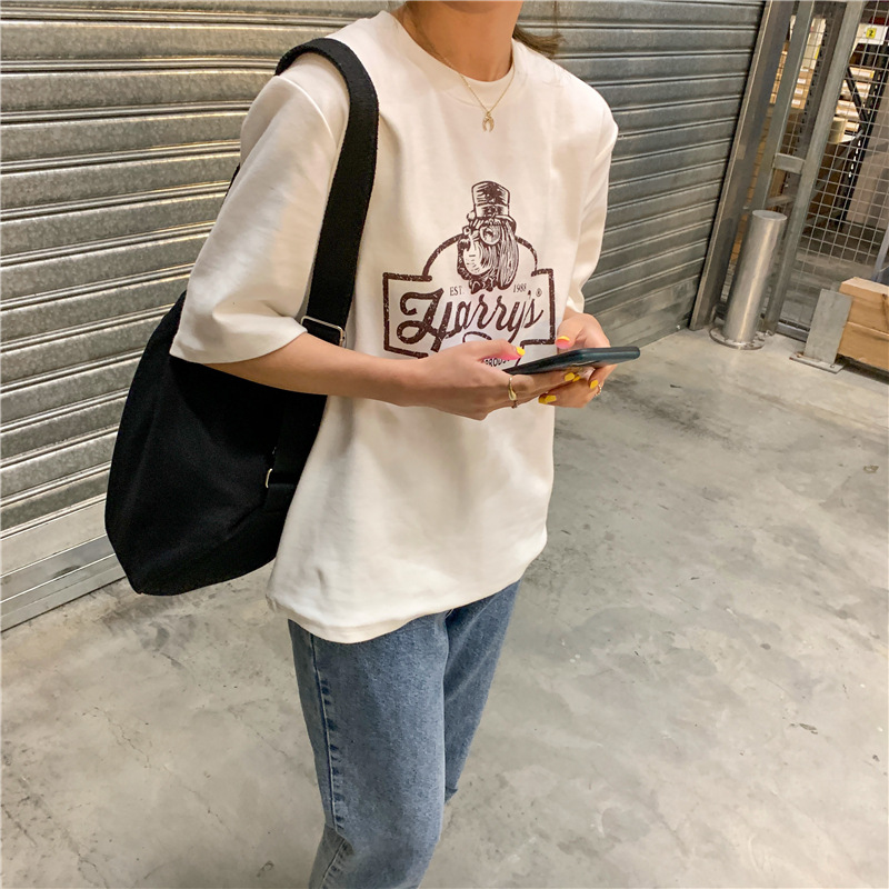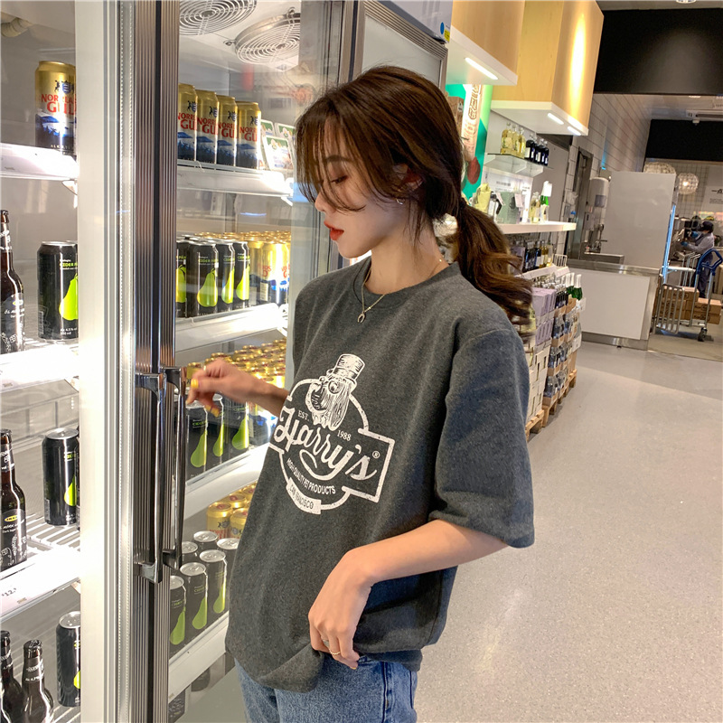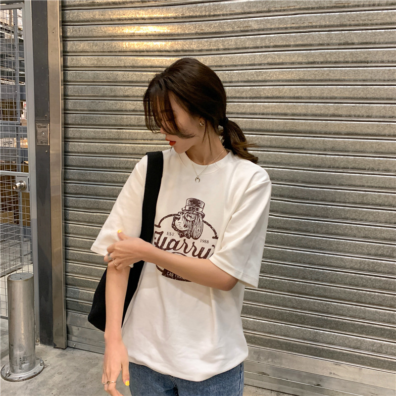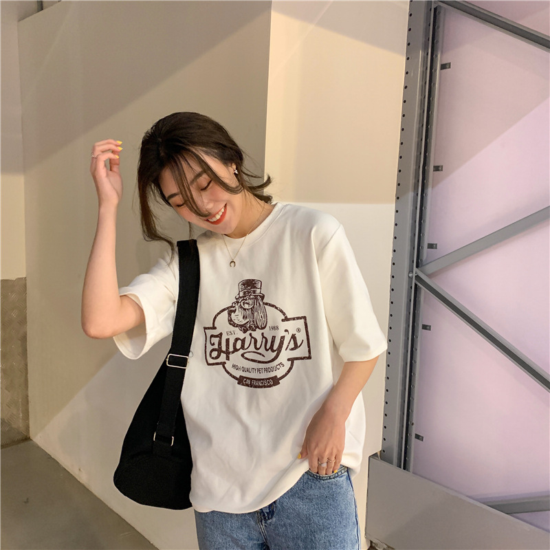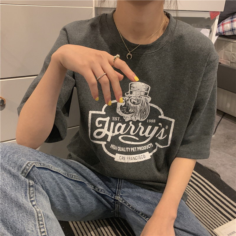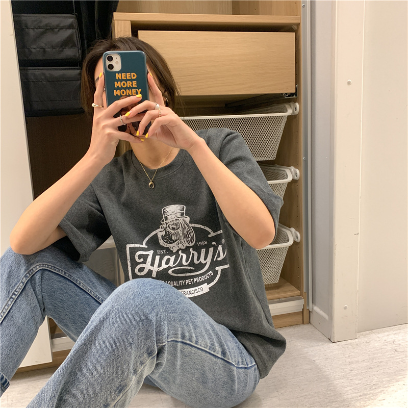 2023 여름 한국 스타일 BF 스타일 루즈한 올매치 프린트 학생 반팔 티셔츠 여성 캐주얼 홍콩 스타일 탑 인 트렌디스토어 가기