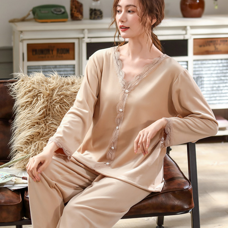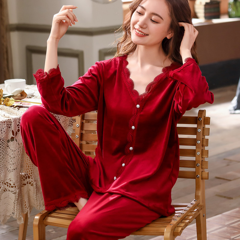 아일랜드 벨벳 잠옷 여자의 양면 벨벳 두꺼운 따뜻한 긴팔 세트 섹시한 레이스 투피스 인터넷 인기있는 가정 의류스토어 가기