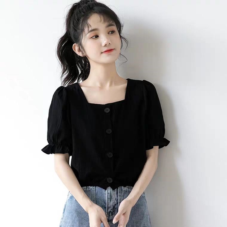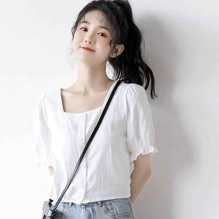 2023 새로운 프랑스어 퍼프 슬리브 셔츠 여성의 다목적 슬림 반팔 셔츠 느슨한 학생 짧은 스퀘어 넥 탑