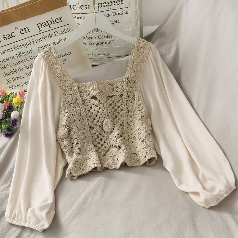 가을 새로운 한국 패션 느슨한 슬림 셔츠 중공 스퀘어 칼라 탑 짧은 긴 소매 쉬폰 셔츠 여성용스토어 가기