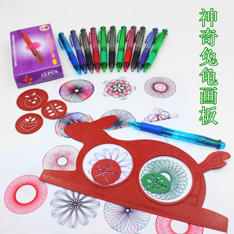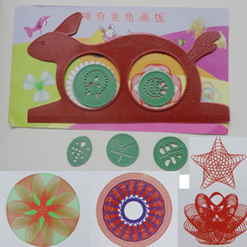 产品说明:选择任一只外齿轮,放兔子圈和乌龟圈使之啮合;右手握圆珠笔插入使笔垂直于纸面,朝一定方向转动,即可画出美丽的曲线花纹图样。注意,内外齿要始终靠紧。需要再换上另一只齿轮或二只以上齿轮,分别先后在原图上重作画,构成更复杂的图案,注意,在换齿轮时,别让内齿轮移动。多功能万花尺共有大小六件。用排列组合画法,可绘出千百万种不同的花纹曲线图案。如采用不同色笔套作画,花纹显得更加美丽。