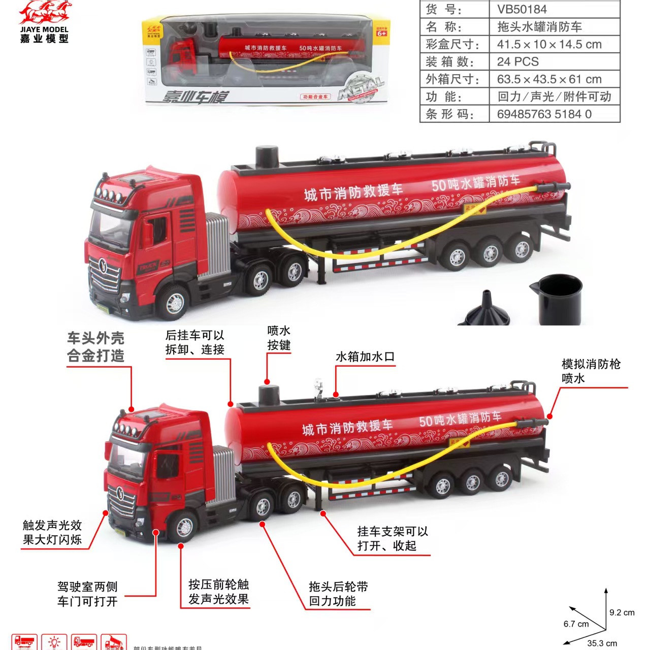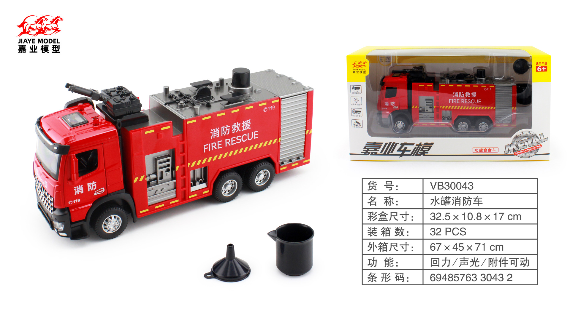 • 【인기 폭발】 30043 물탱크 소방차 1:30 스케일, 차량 앞부분 개방 가능, 사운드 & 라이트, 풀백 기능, 부착물 가동