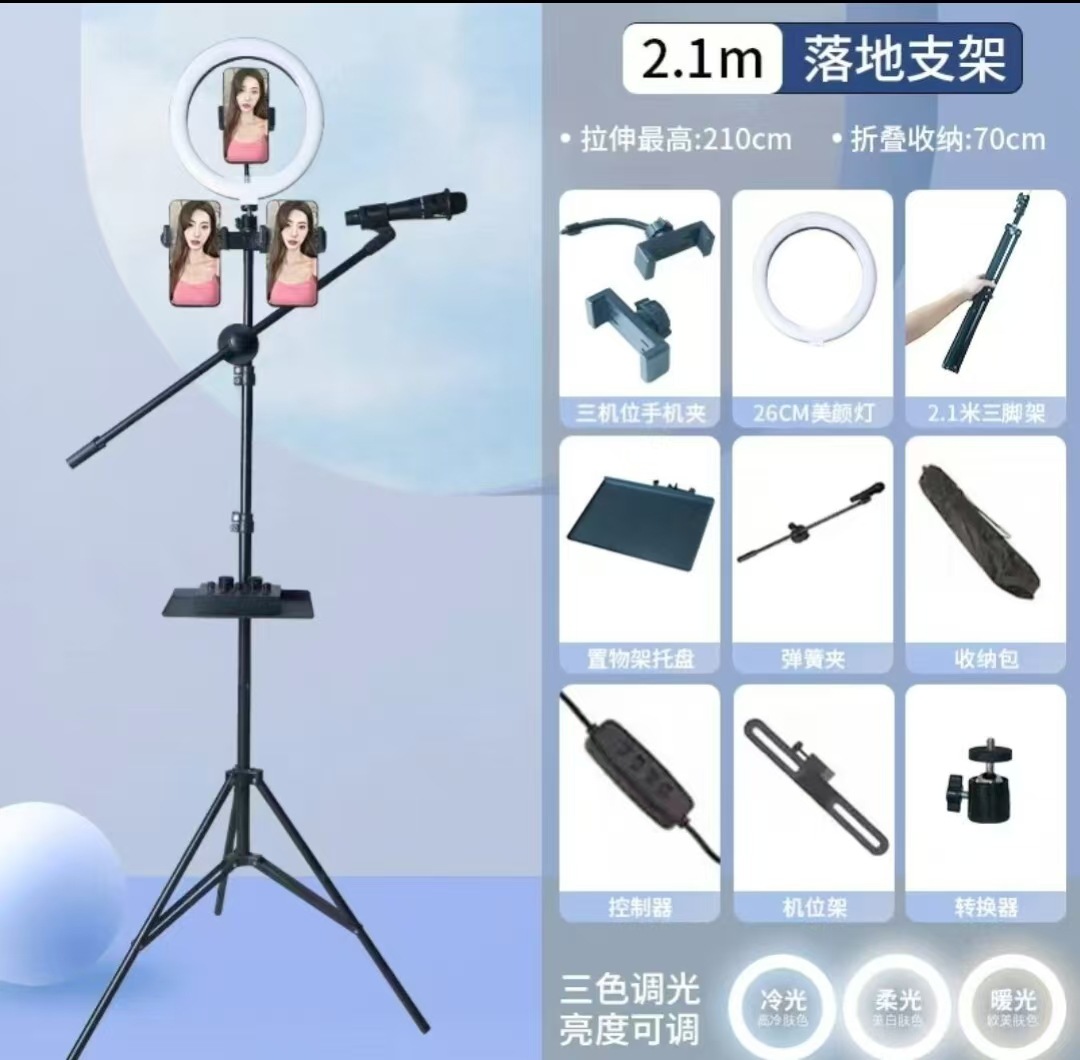 • 1.6 미터 + 금속 팬 틸트 + 26cm 3 색 필 라이트 + 호스 폰 클립