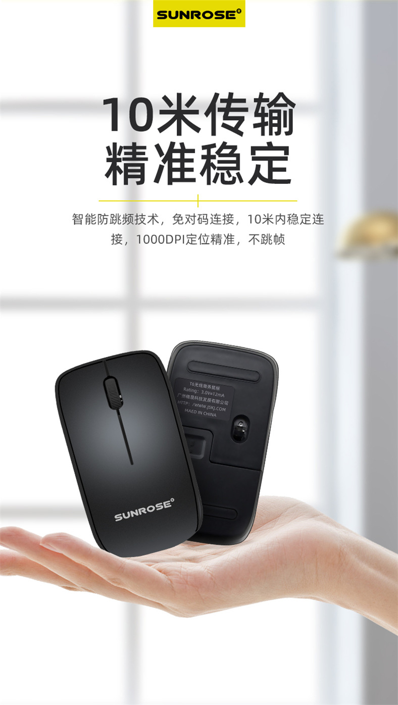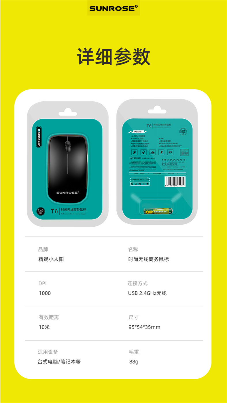 产品品牌:精晟小太阳 工作方式:光电 接口类型:USB接口 传输类型:2.4GHz无线 支持系统:Windows XP/Vista/7/8/10/MAC 分辨率:1000DPI 毛量:88g