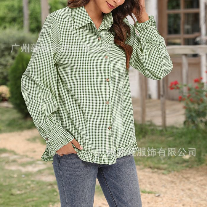 2022 새로운 플러스 사이즈 가을 여자의 일본 면 및 린넨 주름 격자 무늬 옷깃 긴 소매 셔츠 탑