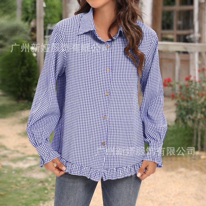 2022 새로운 플러스 사이즈 가을 여자의 일본 면 및 린넨 주름 격자 무늬 옷깃 긴 소매 셔츠 탑스토어 가기