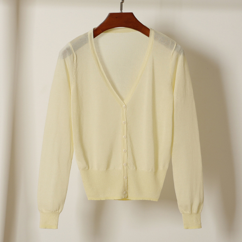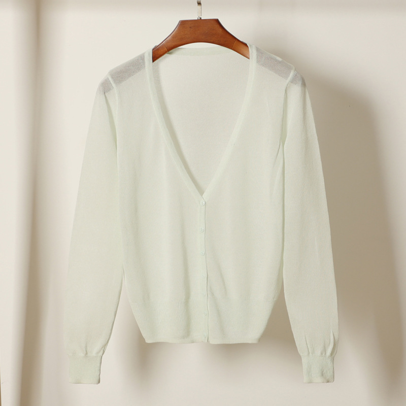 여름용 브이넥 아이스 실크 탑 긴팔 니트 가디건 여성용 자외선 차단 셔츠 에어컨 셔츠 초박형 코트스토어 가기