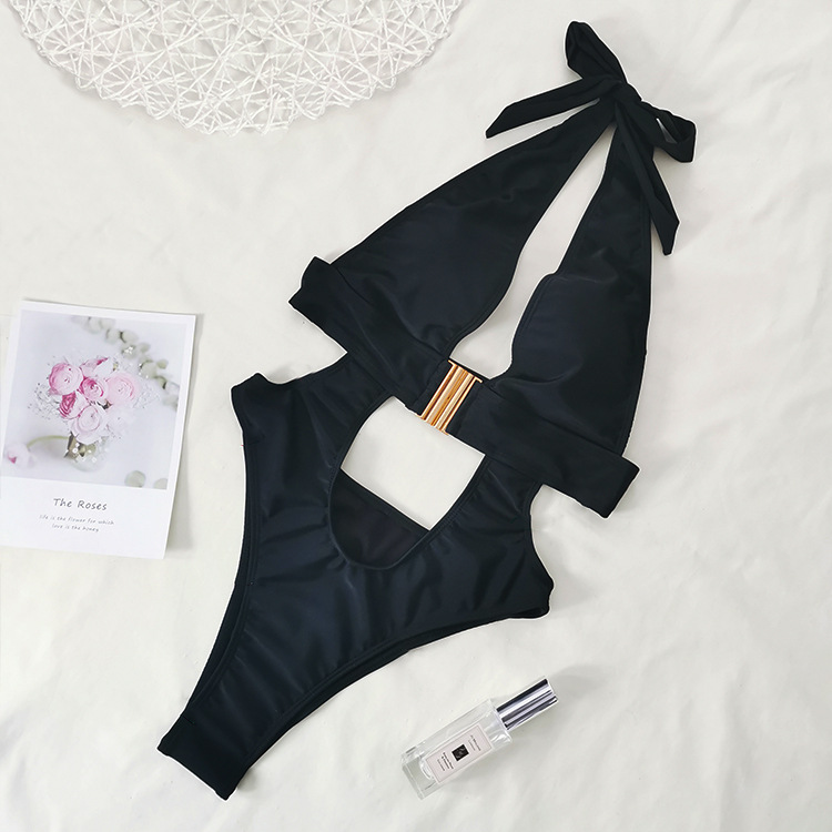 纯色一体式深V性感卡扣设计bikini