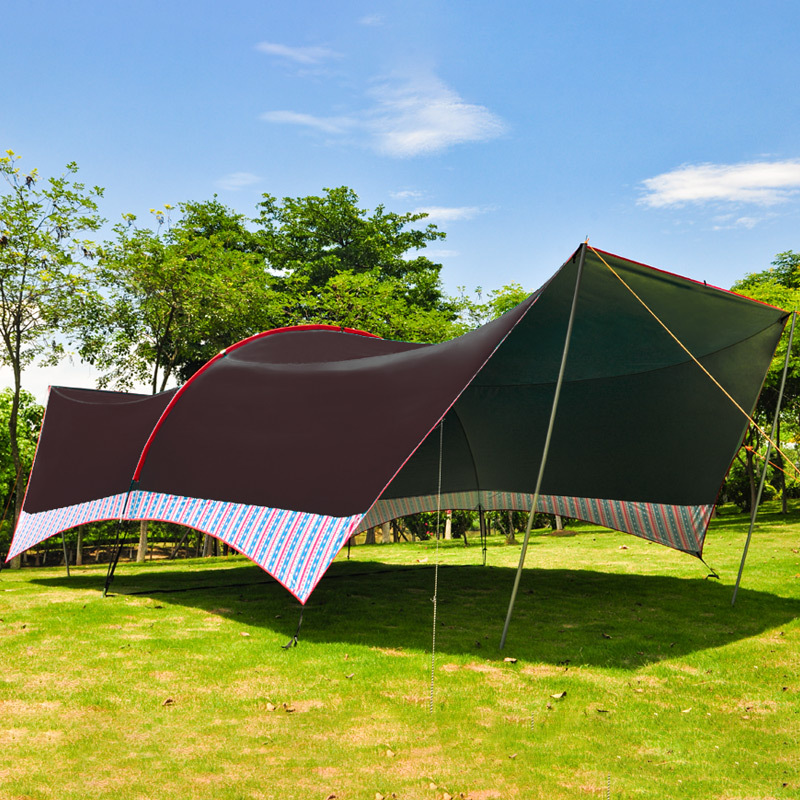搭建方式:手动搭建(可DIY多钟搭建方式),根据不同场地需要,可以两支撑杆搭建起来普通天幕形态,也可以使用纤维杆搭建出图中拱形天幕状态,还可以增加撑杆搭建更大空间的遮阳天幕