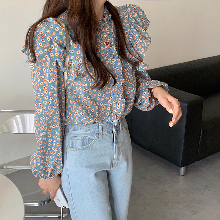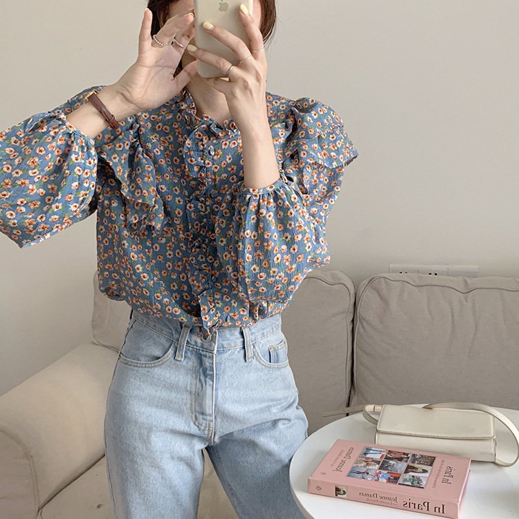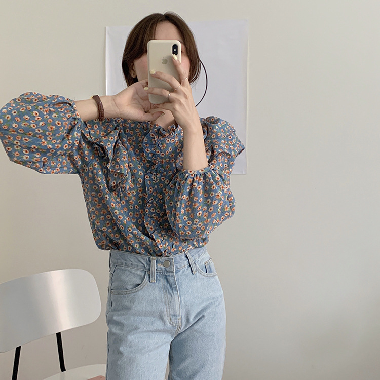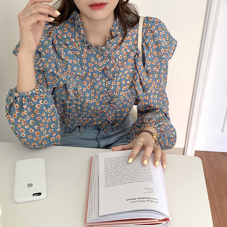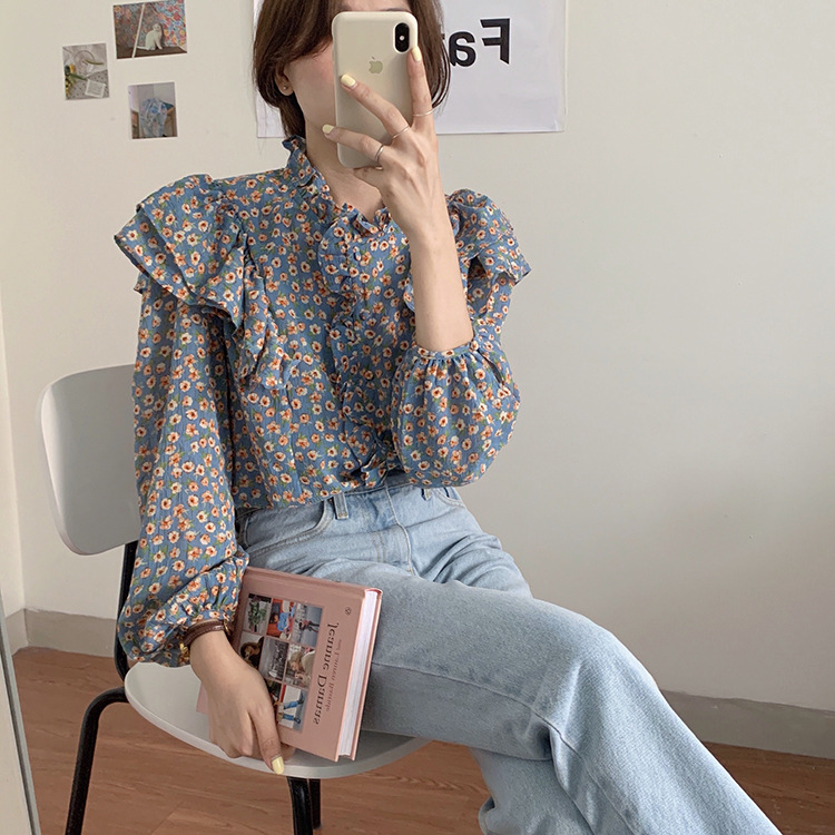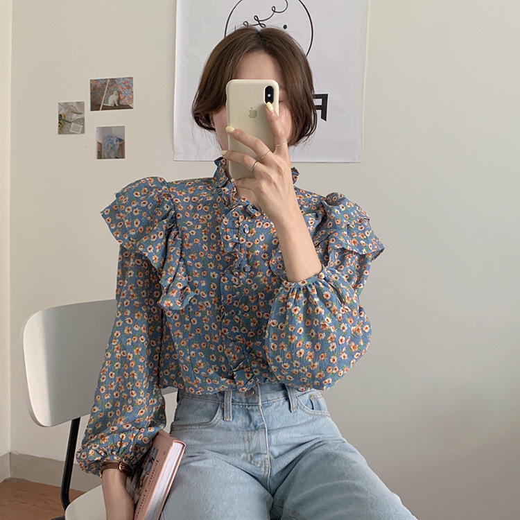 한국 chic2023 가을과 겨울 새로운 스타일 빈티지 빛 성숙한 꽃 탑 긴 소매 쉬폰 셔츠 여성용 셔츠스토어 가기