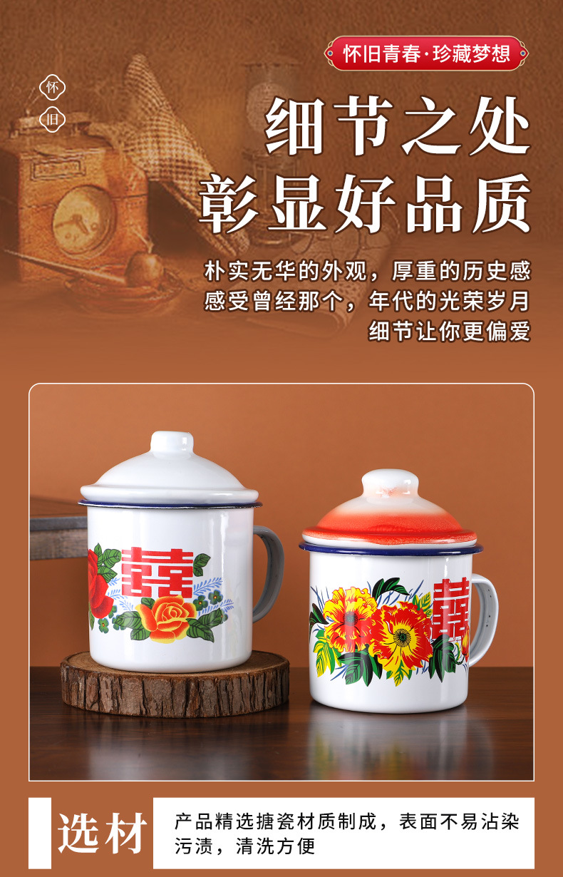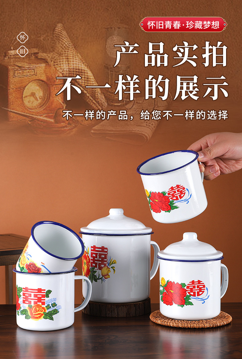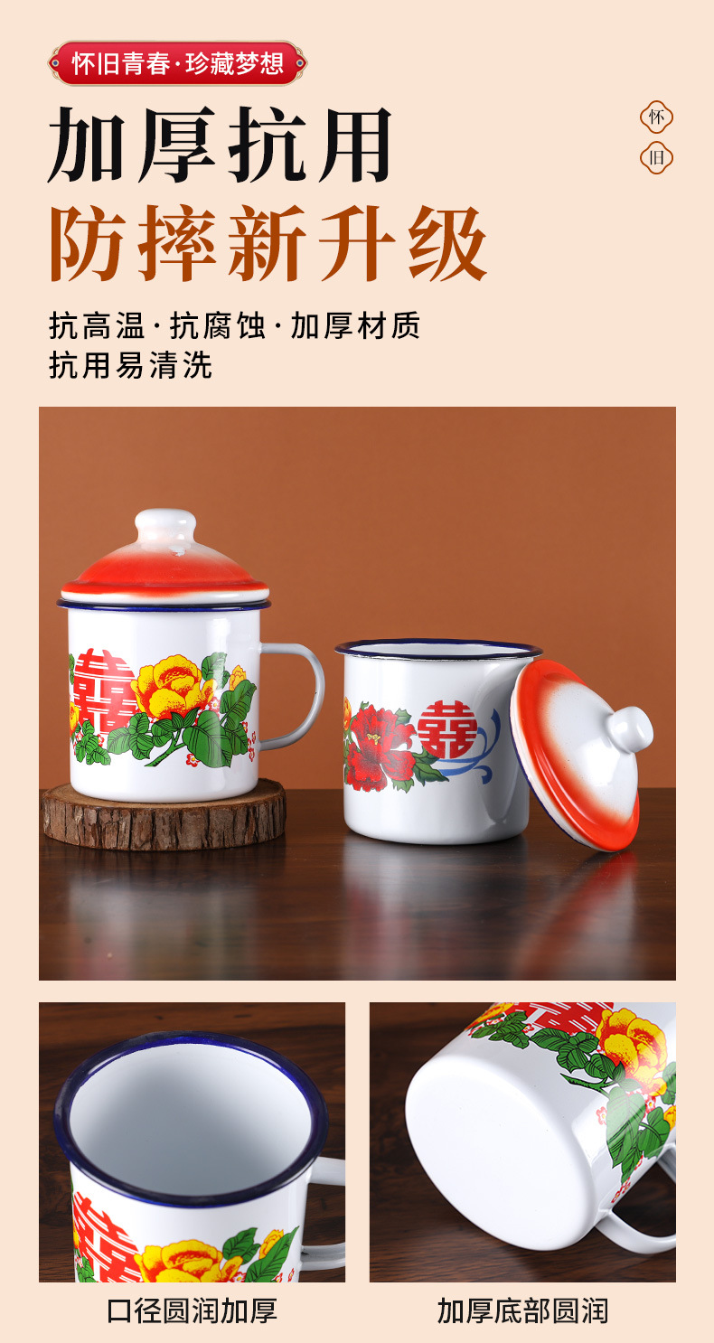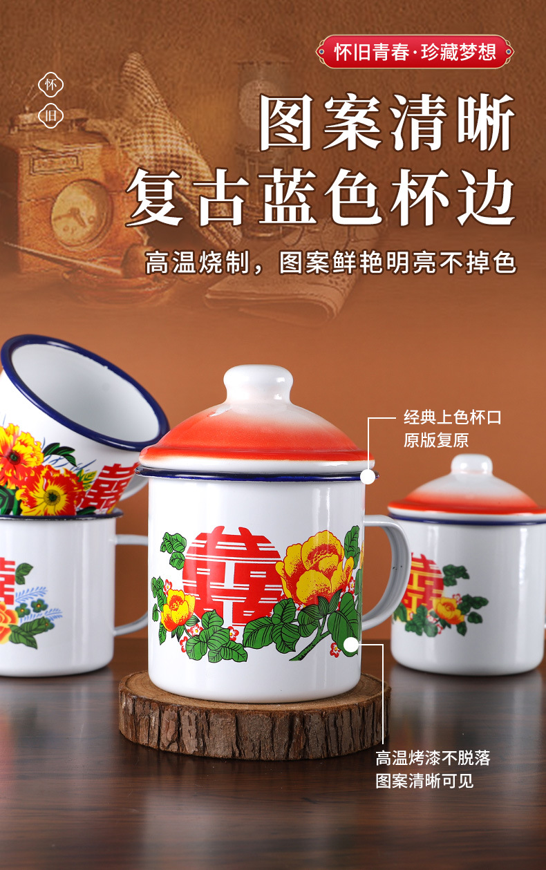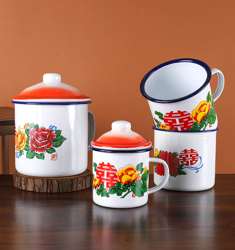구식 이중 행복 에나멜 컵 클래식 꽃 커버 뚜껑이있는 컵 결혼식 차 항아리 대용량 머그잔 로고 인쇄 가능스토어 가기