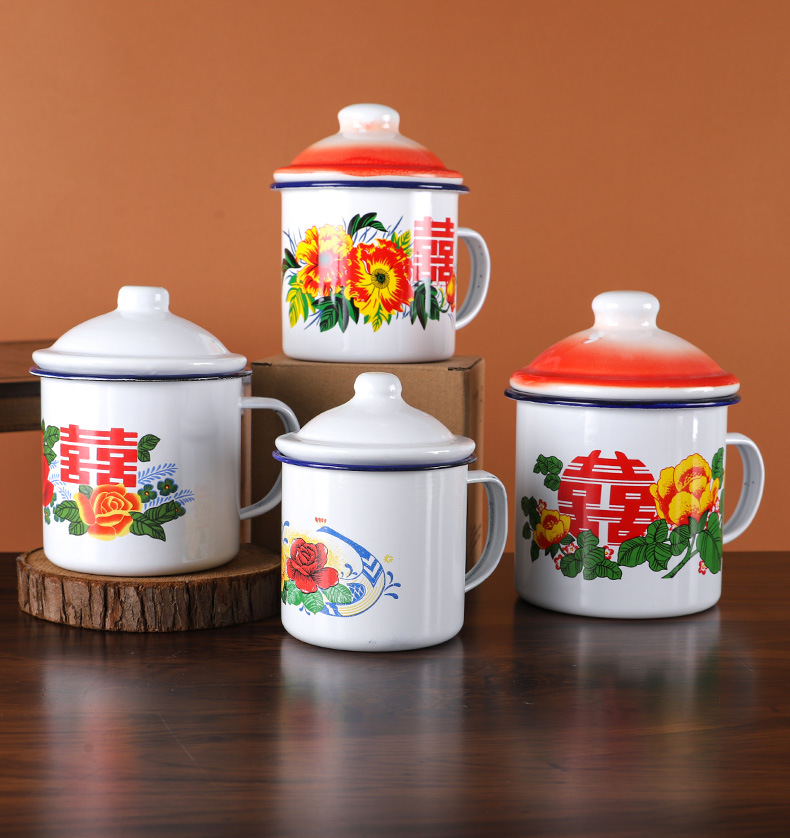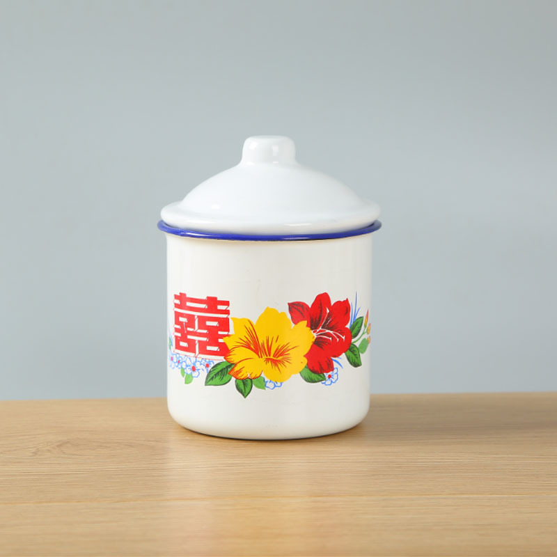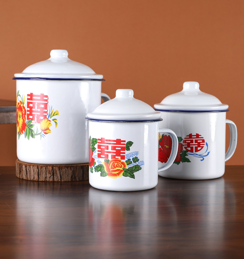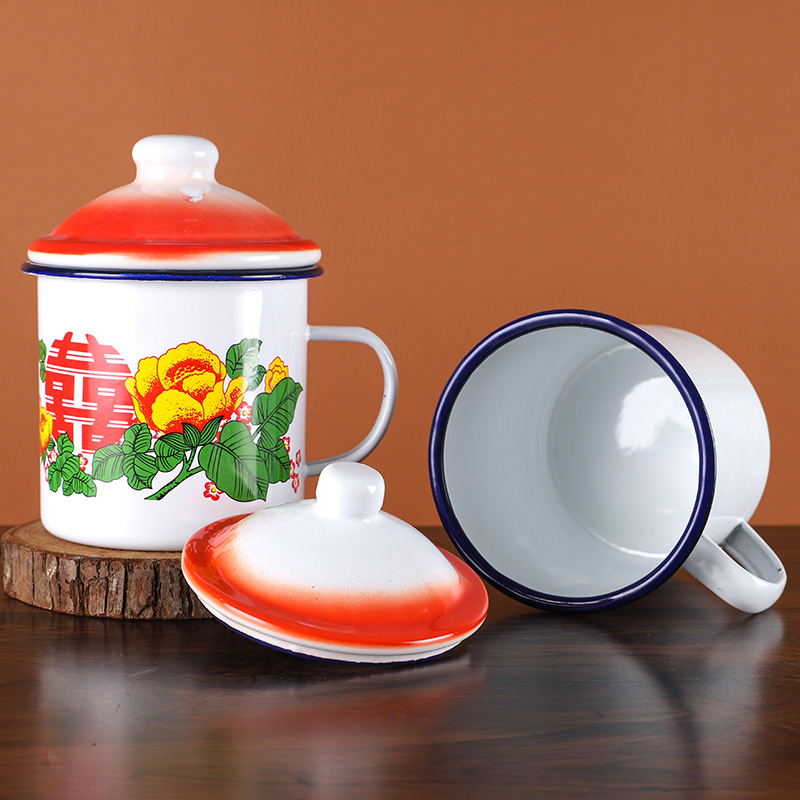 구식 이중 행복 에나멜 컵 클래식 꽃 커버 뚜껑이있는 컵 결혼식 차 항아리 대용량 머그잔 로고 인쇄 가능