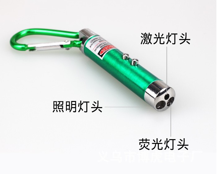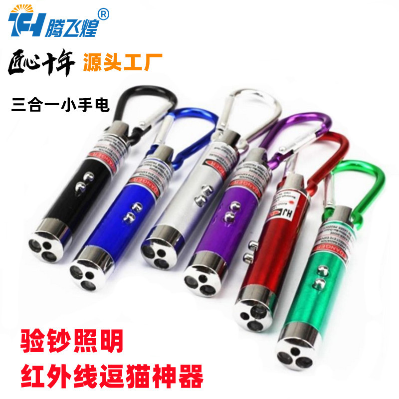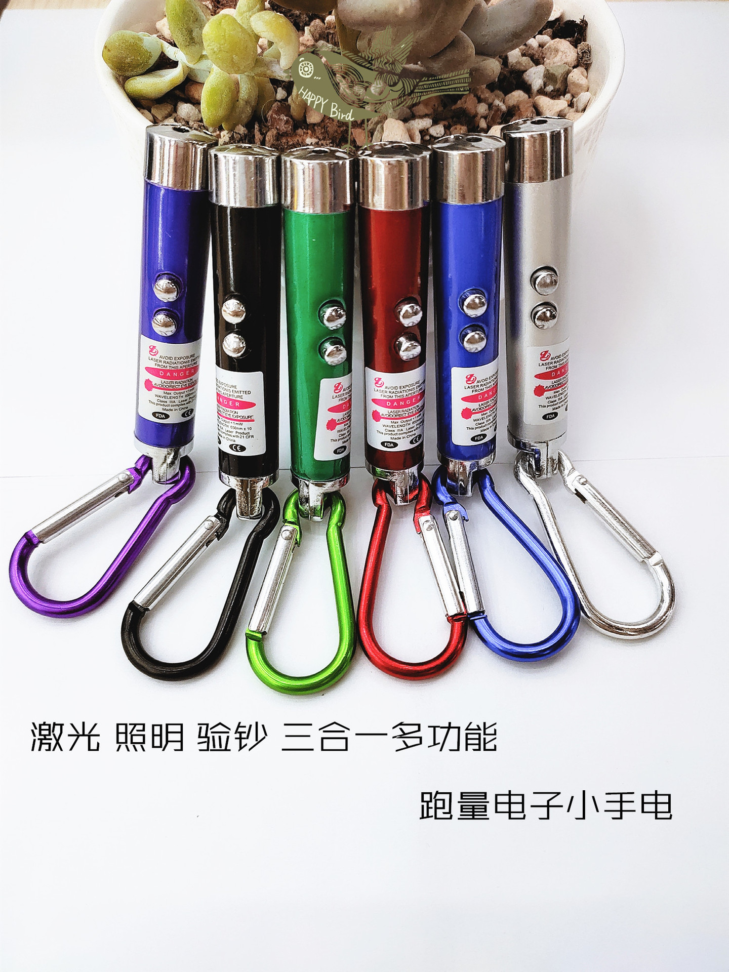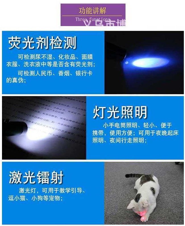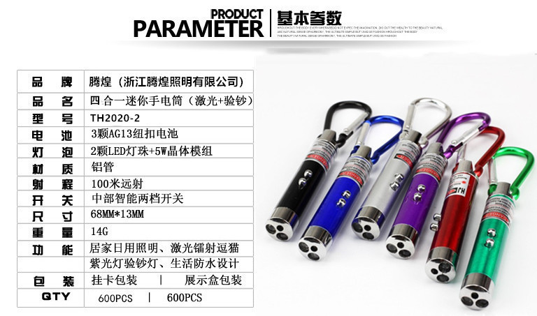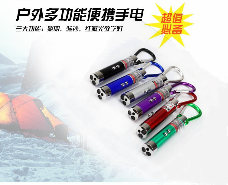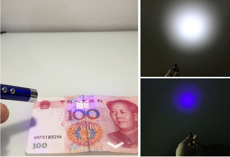 功能:红外线激光指引方向,LED白光照明可当手电,紫光验钞防假钞,闪光警示周边。用两个按钮开关,三颗AG13电子。正面能照出人民币清晰荧光, 又能照出人民币背面金丝线发光,假钞没有水印或水印模糊,反面线条不会发光.是大家验别真假人民币的好帮手,外型小巧,携带方便,实用,是您生活日用中必不可少的电子产品!花最小的钱减少收到假钞的损失