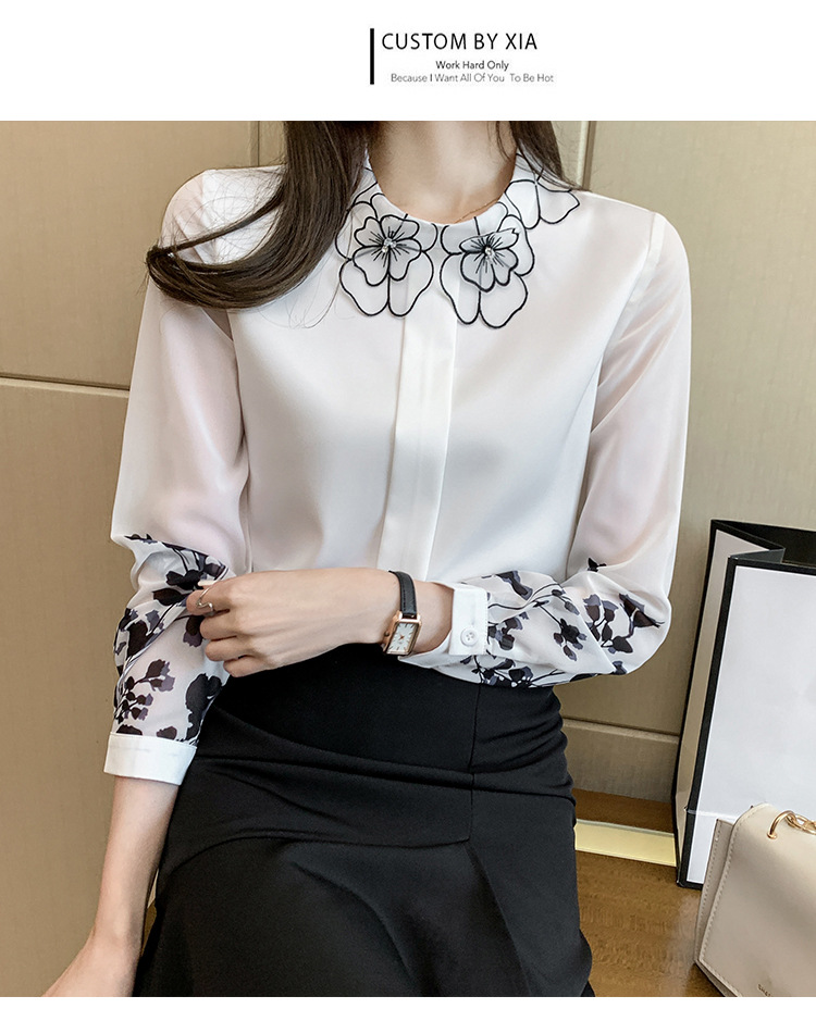 여성용 쉬폰 셔츠 봄, 가을 새로운 한국 스타일 꽃잎 칼라 서양식 슬림 셔츠 긴팔 쉬폰 프린트 탑
