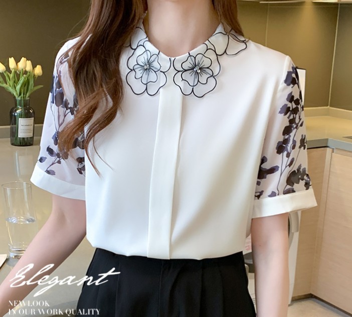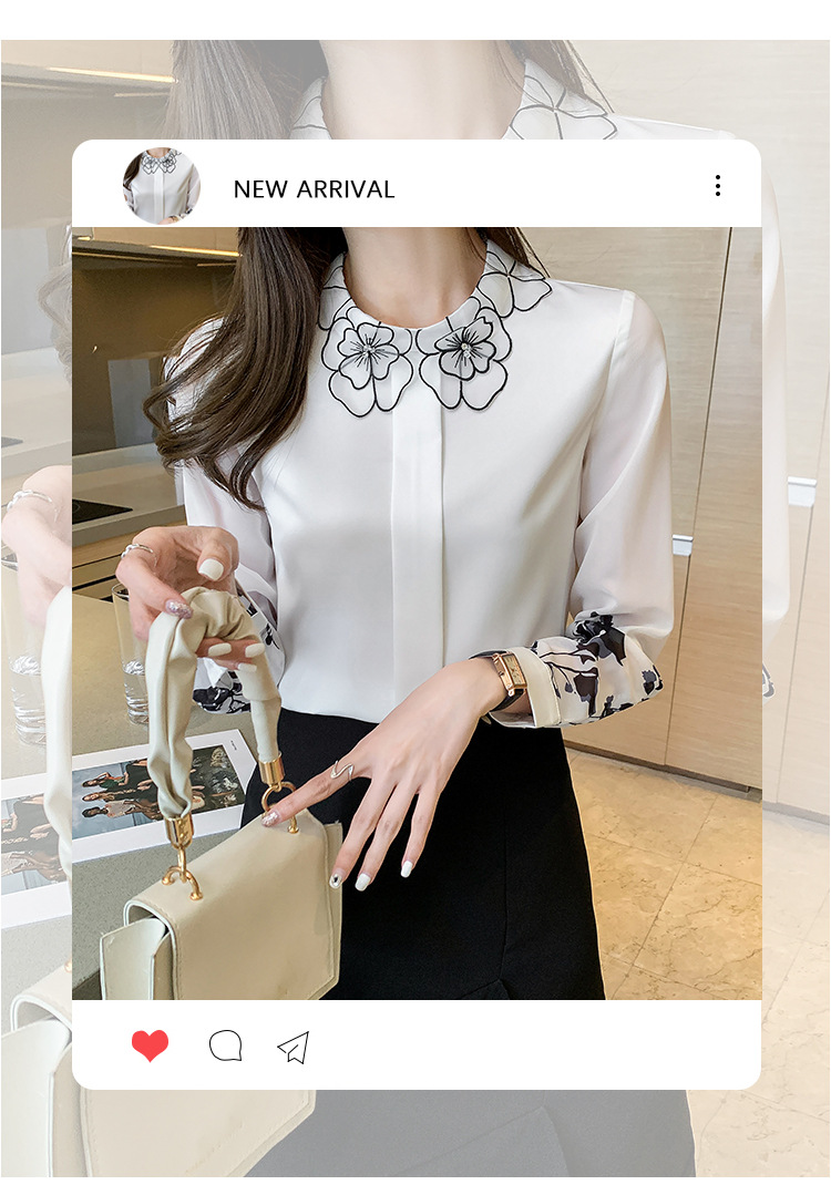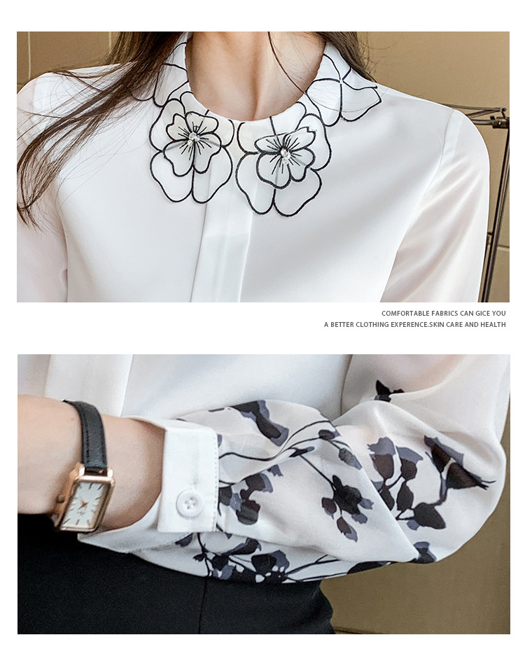 여성용 쉬폰 셔츠 봄, 가을 새로운 한국 스타일 꽃잎 칼라 서양식 슬림 셔츠 긴팔 쉬폰 프린트 탑스토어 가기