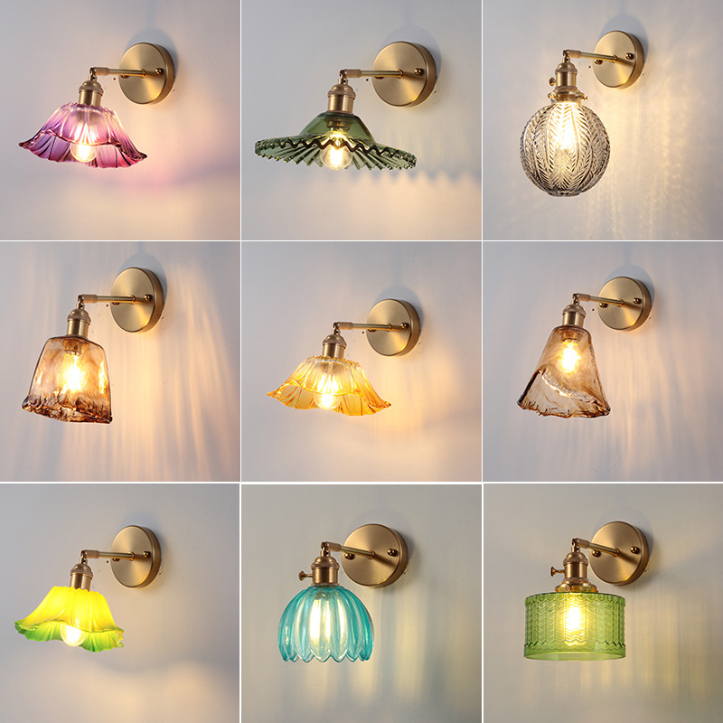 일본 스타일 복고풍 황동 유리 벽 램프 간단한 현대 침실 침대 옆 통로 램프 북유럽 창조적 인 배경 벽 램프