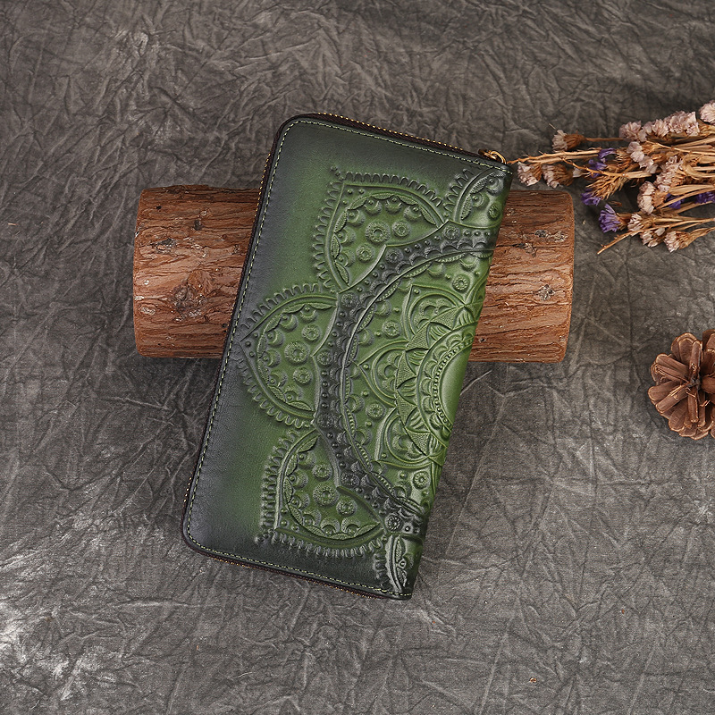국경을 넘는 인기 상품, 천연 가죽 지갑, 다기능 엠보싱 지퍼 클러치백, 1등급 소가죽, 레트로 스타일, 에스닉 스타일 지갑