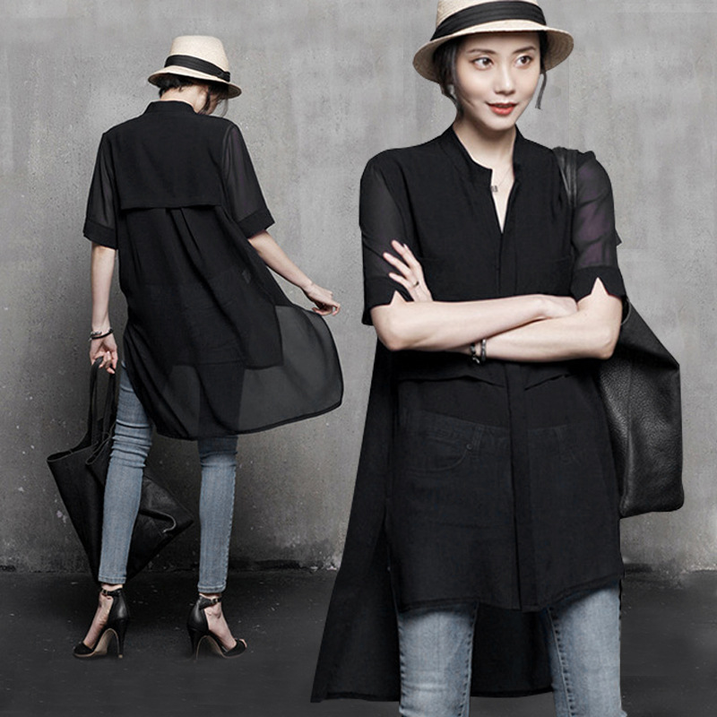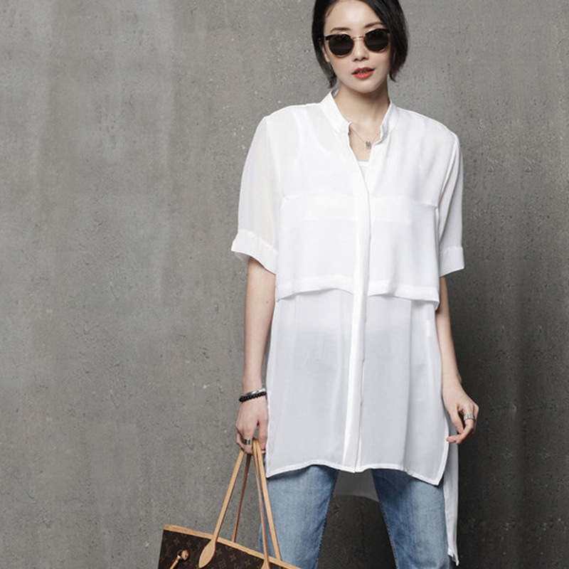 2026 여름 신상 한국 스타일 중간 길이 대형 여성복 루즈핏 반팔 쉬폰 셔츠 여성 블라우스