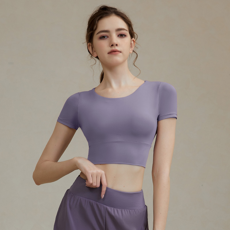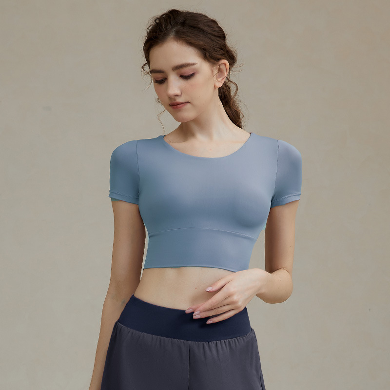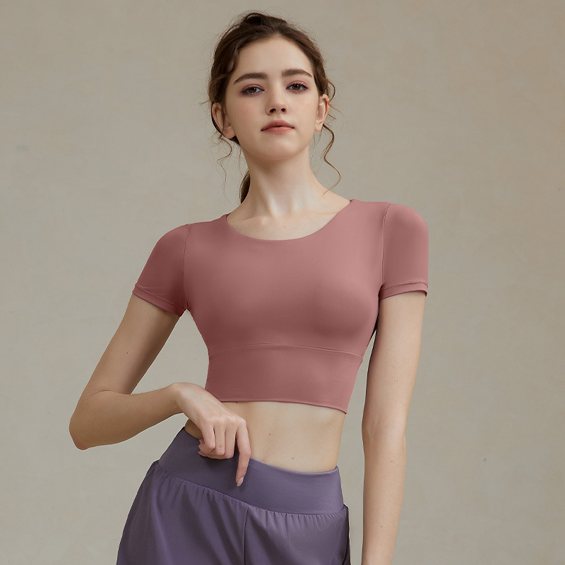 크로스 보더 요가 의류 반팔 여성용 벨트 가슴 패드 섹시한 중공 짧은 스포츠 뷰티 백 속건 피트니스 러닝 탑스토어 가기