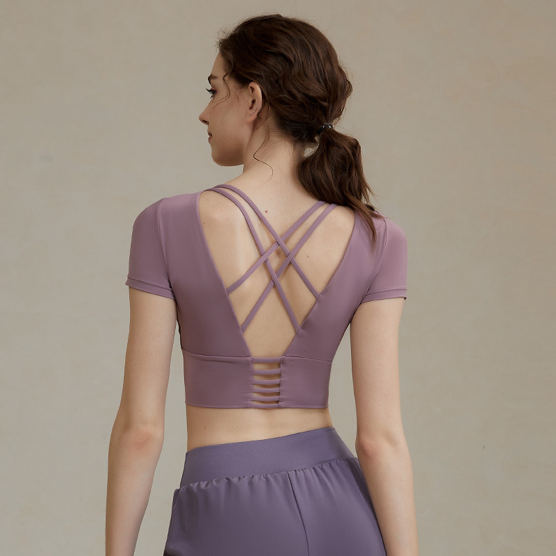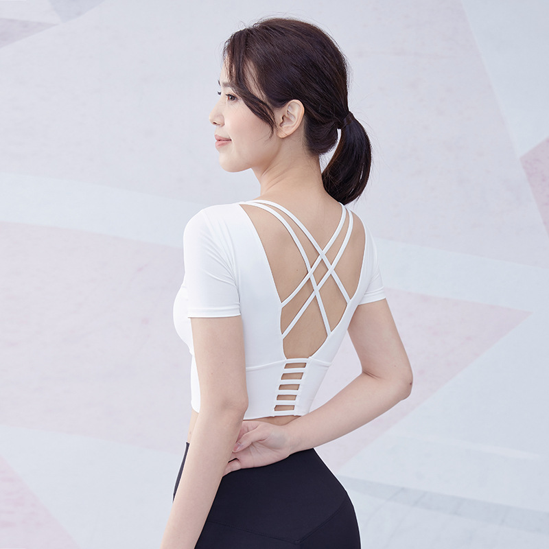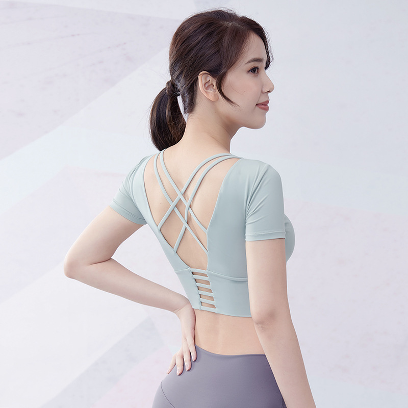 크로스 보더 요가 의류 반팔 여성용 벨트 가슴 패드 섹시한 중공 짧은 스포츠 뷰티 백 속건 피트니스 러닝 탑