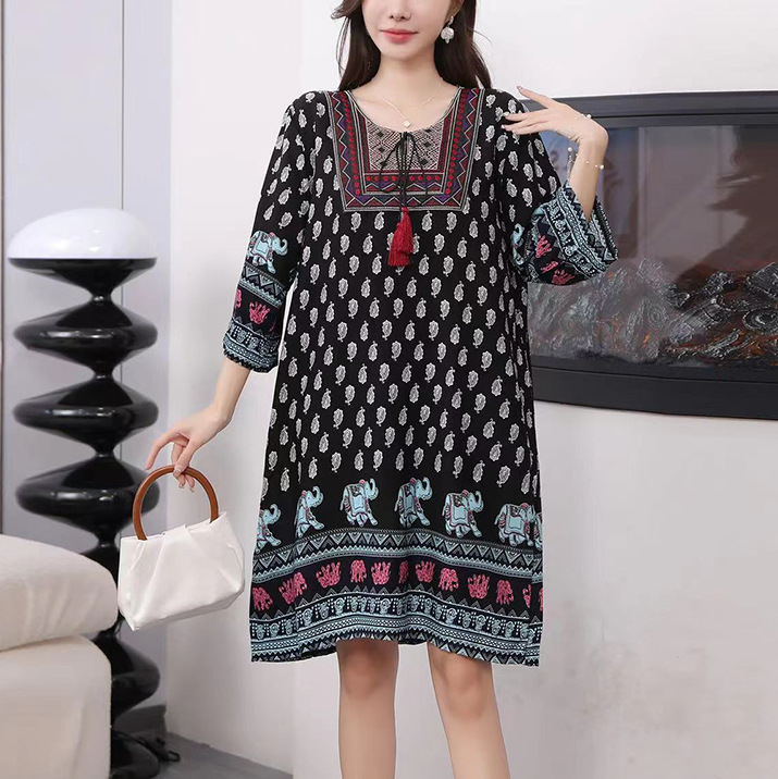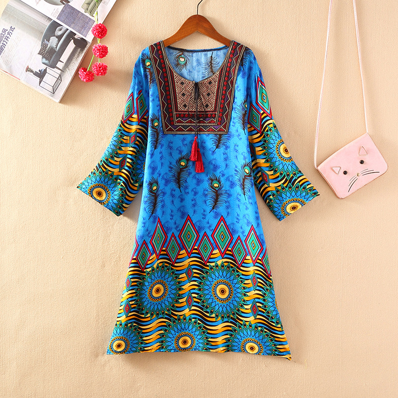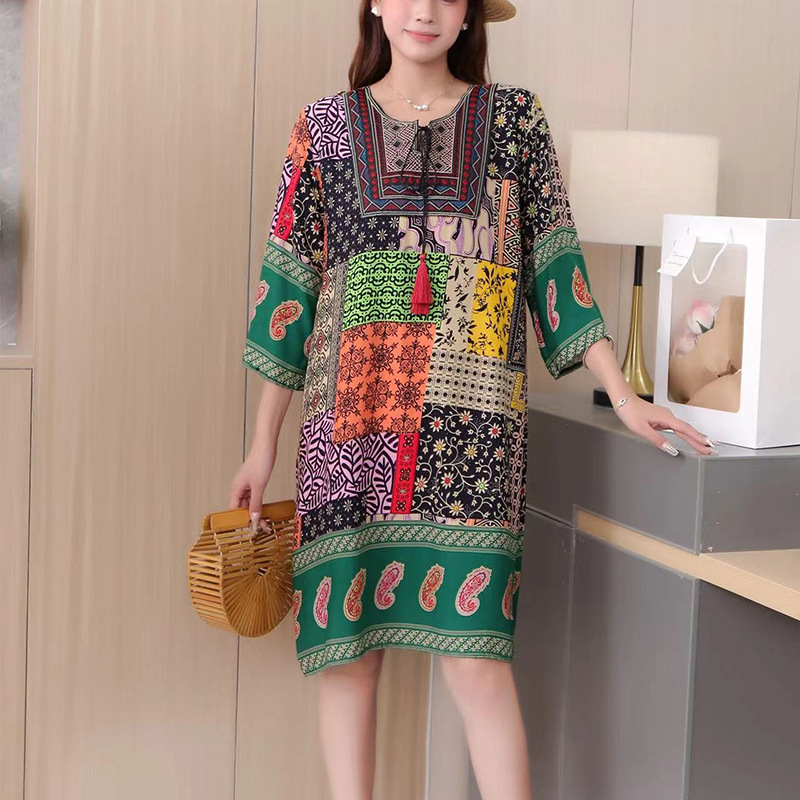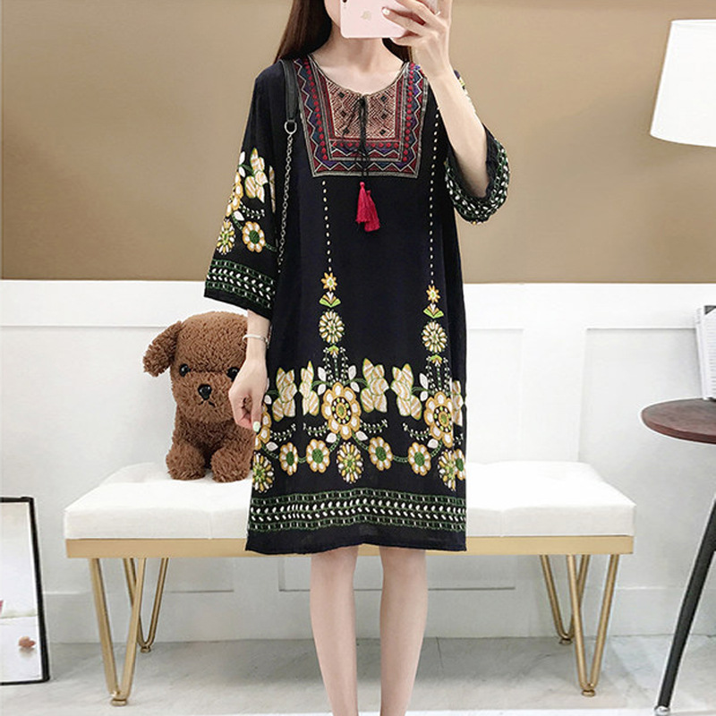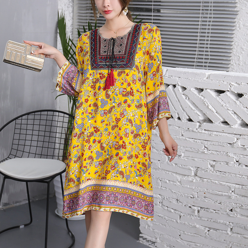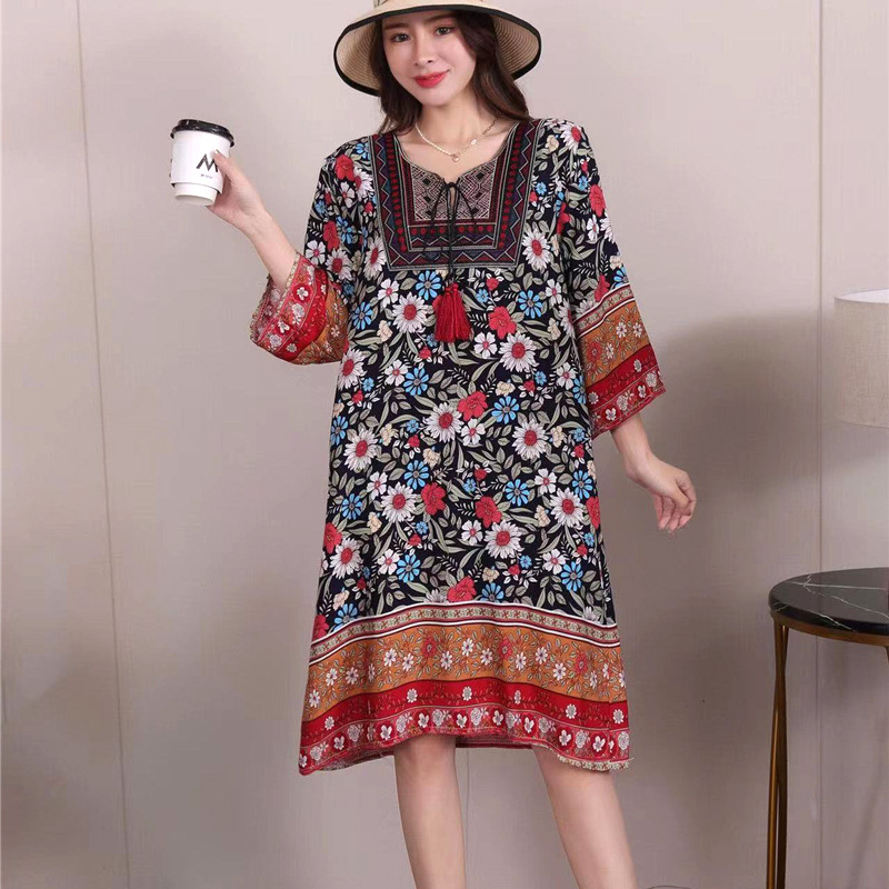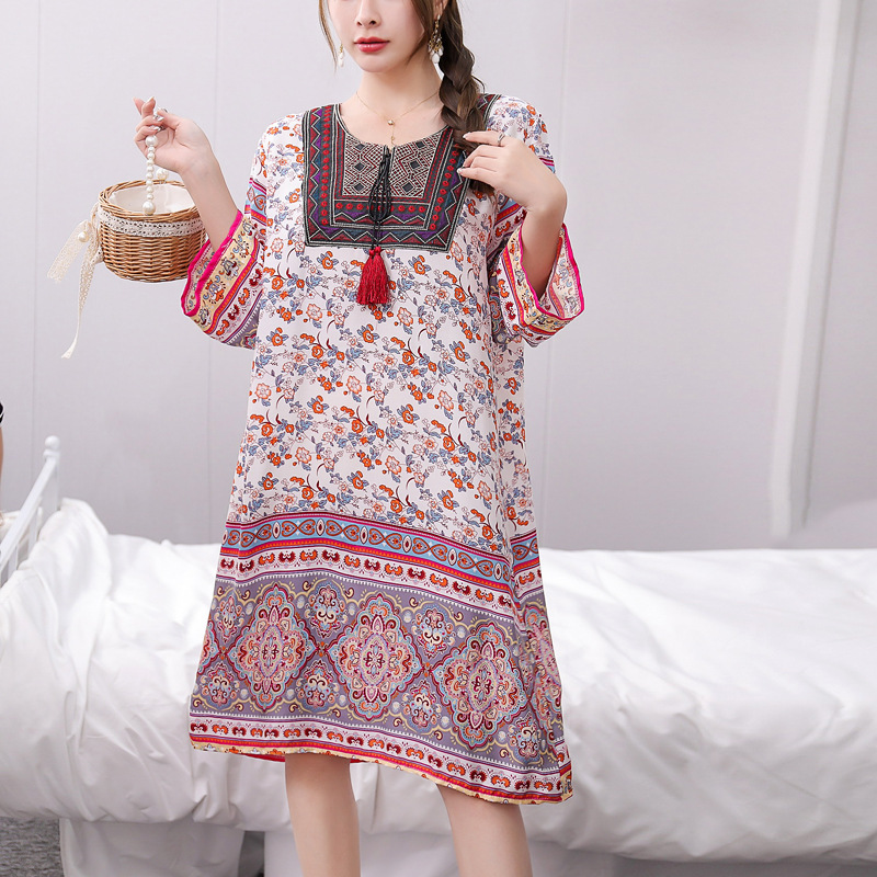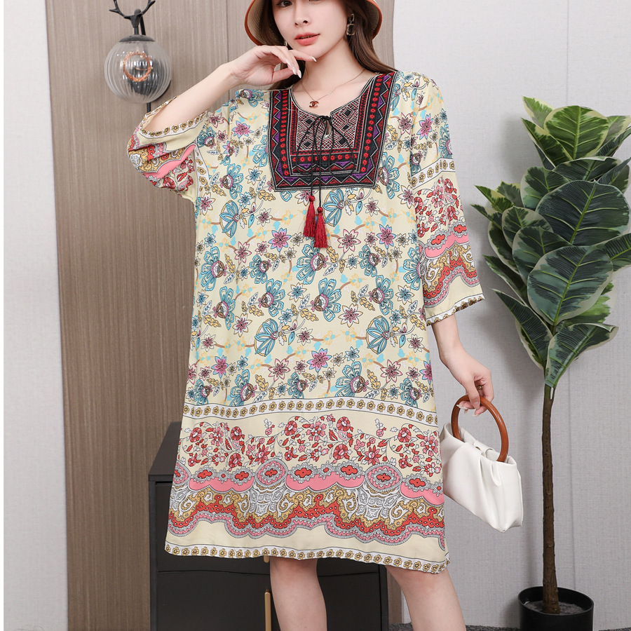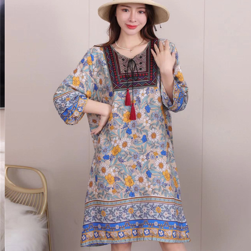 크로스보더 면 실크 원피스, 문학적 복고풍 민족 스타일 여성복, 태국 스타일 A라인 원피스, 면 원피스, 여름용스토어 가기